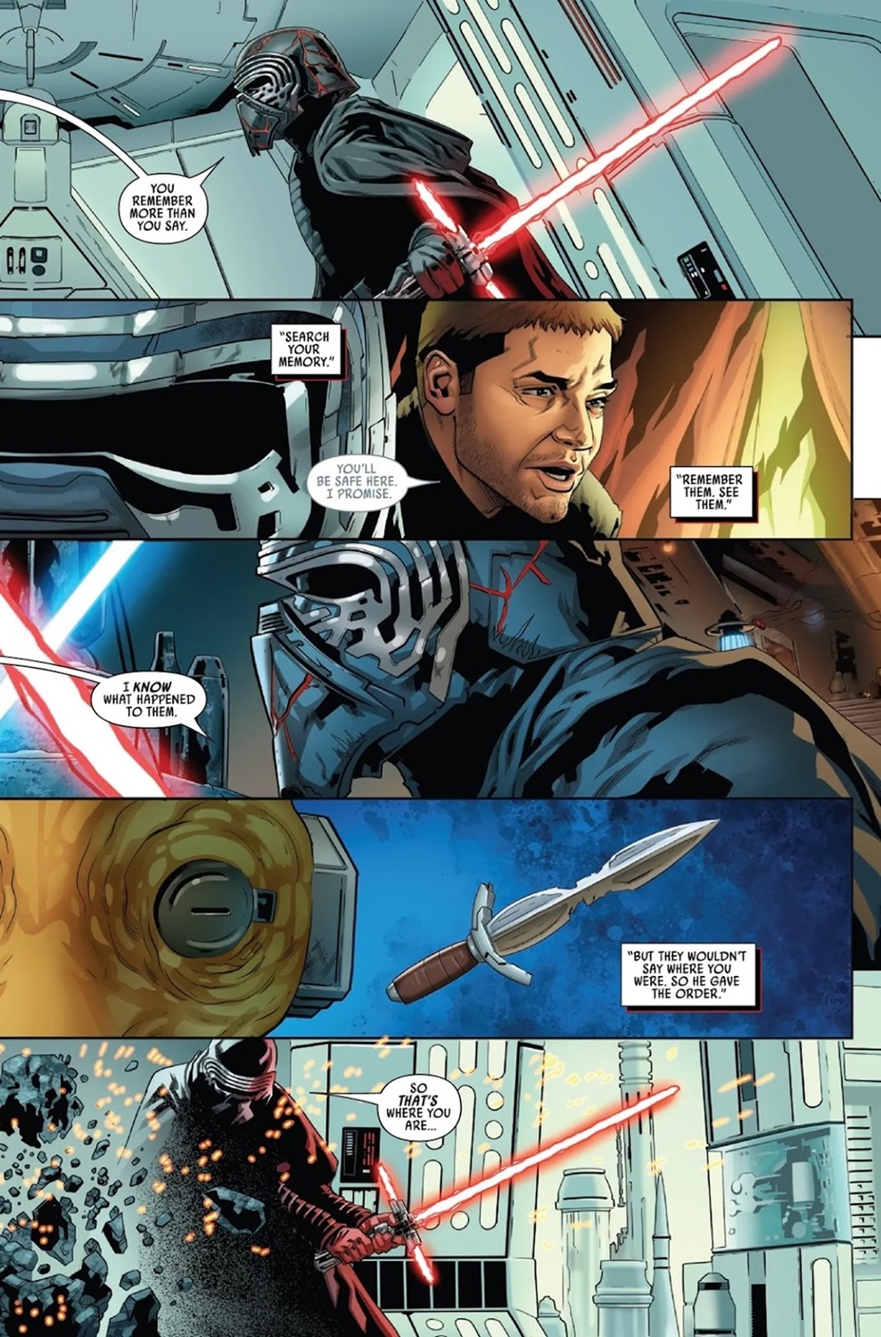 The Rise of Skywalker #3 opens with the scene from the movie in which General Hux reveals to Poe Dameron, Finn, and Chewbacca that he is indeed the spy feeding the Resistance information from within the First Order. Sadly this decision does not play out well for poor Hux in the end, but writer Jody Houser and (especially) artist Will Sliney have a lot of fun recreating that turn of events on the comics page. I’m also enjoying the moody colors by Guru-eFX, but I have to say I was taken out of the moment by the moment when Kylo Ren says to Rey, “Your parents were no one. They chose to be. To keep you safe." I still think this is one of the dumbest moments in Star Wars history that immediately undoes one of the boldest and most interesting creative choices from the previous entry in the Skywalker Saga, The Last Jedi.