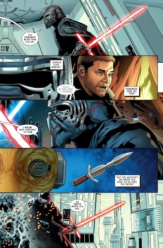 Still, Houser and Sliney continue to make the best of the uneven source material they’re working with here, and I’ll add additional praise to the artist for making such interesting choices with his interpretation of the scenes that play out in this chapter. On Houser’s part, we do get another added conversation (not contained within the body of the film) between Resistance technician Rose Tico and General Leia Organa about the Final Order and its fleet, plus some new lines of dialogue that– thankfully– make it more clear what Finn wanted to tell Rey, and what his relationship with the Force might be. We also get to see a flashback of Jannah in her First Order stormtrooper armor and a vision Rey has of Darth Vader dueling his son Luke Skywalker in the second Death Star’s throne room, but the rest is a fairly straightforward adaptation of the movie, which is fine and works well enough.