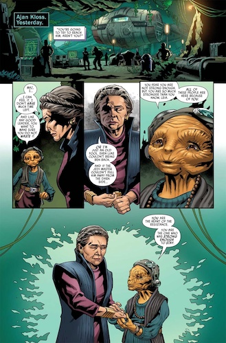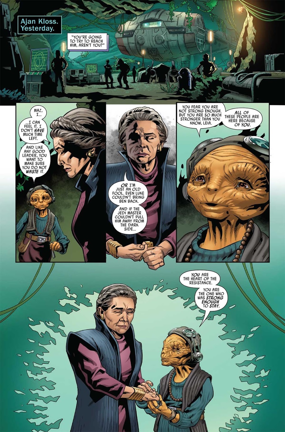 The best thing about this adaptation of The Rise of Skywalker has undoubtedly been getting to spend more time with General Leia Organa in her final days. As you’re probably aware, because actress Carrie Fisher had passed away before the production of the film, director J.J. Abrams was limited to using leftover footage and dialogue from The Force Awakens in bringing in a final performance for Leia in 2019. But here, writer Jody Houser and artist Will Sliney can give us additional Leia scenes like the one that opens this issue, featuring Maz Kanata assuring her old friend that she is indeed “strong enough" to pull her son Ben Solo (AKA Kylo Ren) away from the dark side of the Force and also that she is “the heart of the Resistance," despite Leia’s hesitance.
