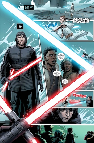 Meanwhile, we get more of Sliney’s eye-catching mirror-image page composition as Kylo goes up against Rey in a lightsaber duel on the wreckage of the second Death Star as waves crash around them in the ocean on the moon of Kef Bir. And that moment when Leia finally gets through to her son is equally as moving here as it was in the movie, as is the scene where Ben imagines his father (complete with Harrison Ford’s out-of-character stubble from his probably single day on The Rise of Skywalker set) talking him back toward the light. This part of the story also gives us Poe Dameron’s solemn meeting with Lando Calrissian on Ajan Kloss after Leia’s death and Rey’s reunion with now-wiser Jedi Master Luke Skywalker (returning in Force ghost form) on Ahch-To, during which she acquires Leia’s old lightsaber.