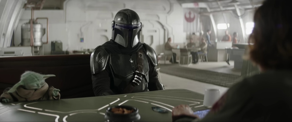 Shot 7: Now Mando has taken the seat next to Grogu, and we get a better look at the background, further establishing this as Adelphi base. The Rebel Alliance / New Republic insignia hangs on a flag over a table with some rangers congregating.
