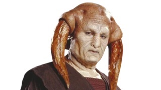 Shot 15: Still in the bar, Grogu jumps onto Mando’s shoulder. Odd-looking light fixtures or cages hang all around, while a patron of the Iktotchi species stands in the background. Iktotchi first appeared in Star Wars: Episode I - The Phantom Menace, and is most famously represented by Jedi Master Saesee Tiin.