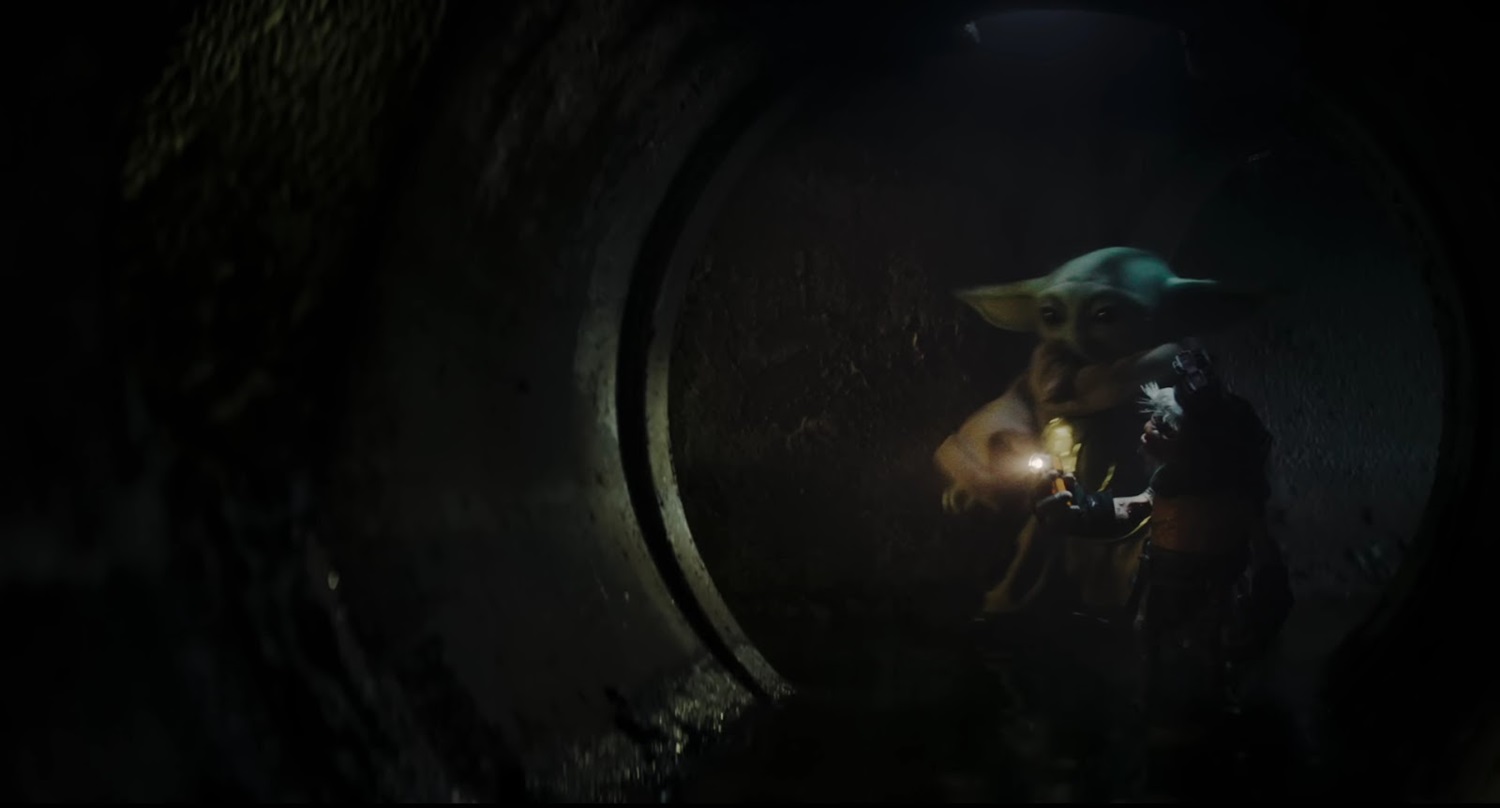 Shot 4: An Anzellan (maybe Babu Frik from Star Wars: Episode IX - The Rise of Skywalker, maybe one of the other unnamed Anzellans from The Mandalorian) leads Grogu through a sewer. The location is unidentified.