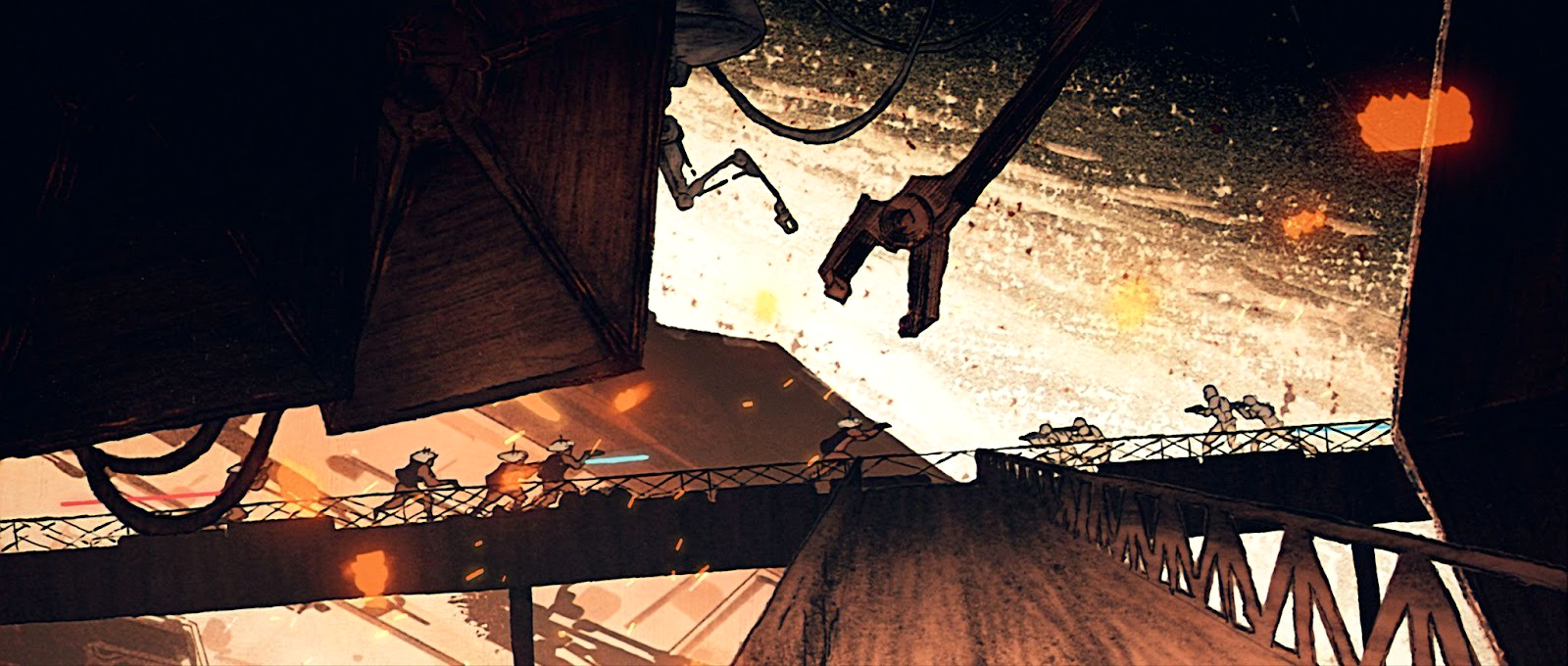 For months now, Lucasfilm has been showcasing “Black” at animation festivals around the world in promotion of Visions Volume 3, and now that I’ve finally seen it I can definitely understand why. I’d have to go back and watch the first two volumes to be sure, but to my mind this is the first entry in the anthology series to really take the concept and run with it, resulting in pure art rather than just another regurgitation of the Hero’s Journey. “Black” is a gorgeously animated 13-minute exploration of the existence of an Imperial stormtrooper, told through a cacophonic montage of destruction accompanied by discordant jazz music and the occasional deathly silence. It’s a nightmarish examination into what it must feel like to be a cog in the Imperial machine– a pawn in Palpatine’s inhuman plans, and the Emperor himself is indeed represented here by an amorphously evil form, ever reaching out to claim the souls of more of his all-too-obliging soldiers.