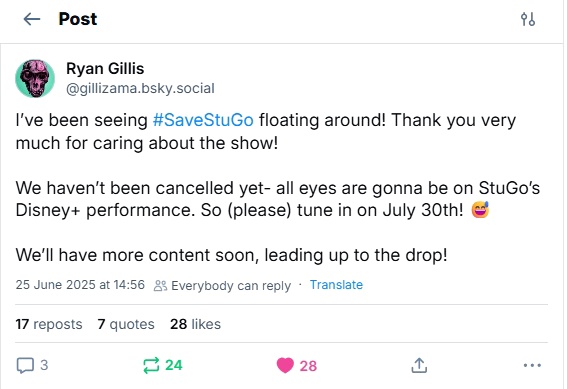A small update from creator Ryan Gillis confirms the worst has not yet officially happened to StuGo, but to get more episodes, we all need to watch it again when it arrives on Disney+ next month.