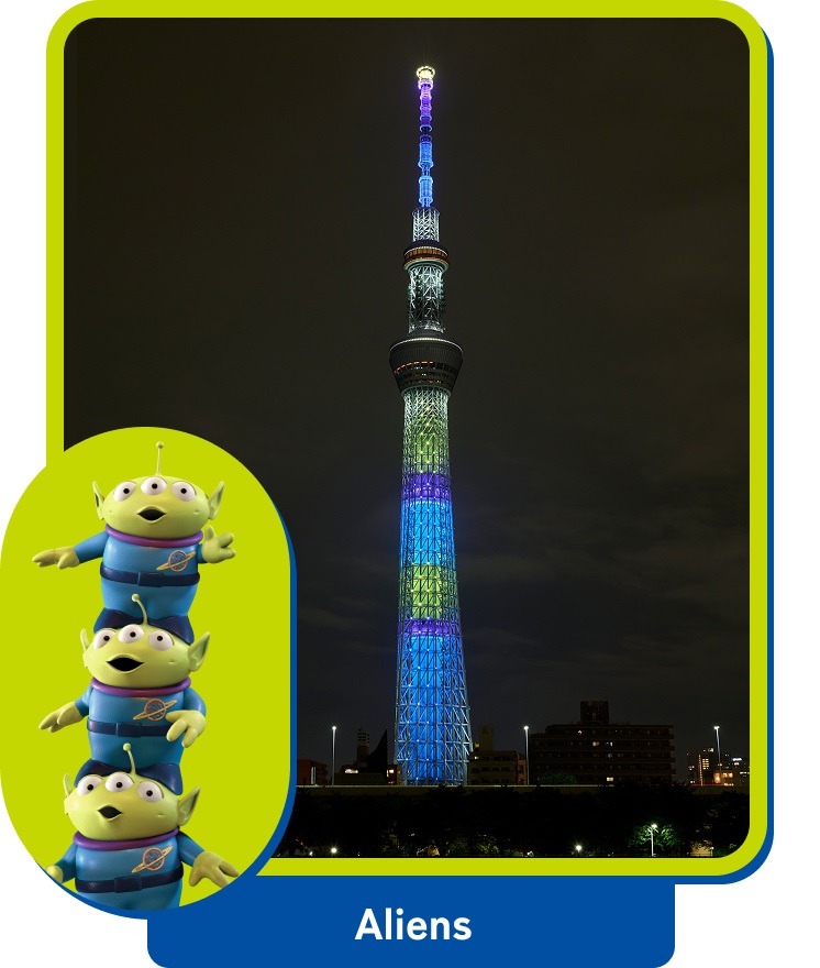 - The exterior of the tower gets in on the fun with special lighting as well, changing every few minutes to represent a different Toy Story character - Woody, Buzz, Jessie, Bullseye, Bo Peep, or the Aliens.