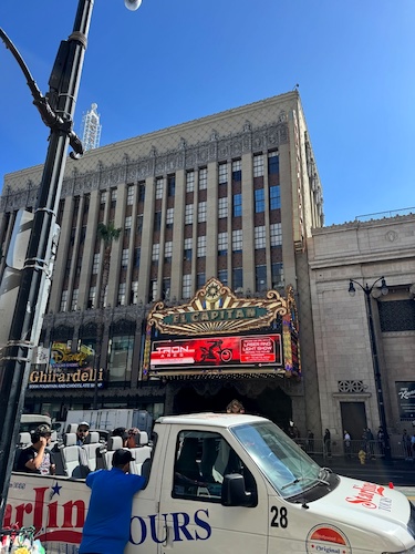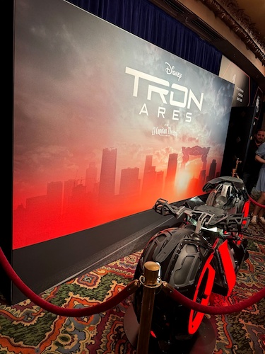 Arriving at the famous El Capitan Theatre on Hollywood Boulevard, I found the legendary movie house’s marquee lit up with the TRON: Ares key art.
