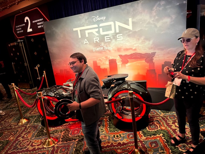 A TRON: Ares Lightcycle was set up in the lobby as a guest photo op.
