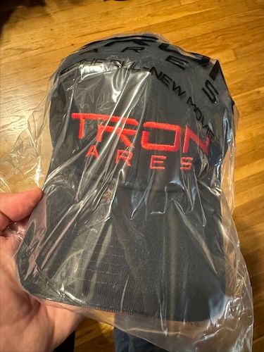 Included with my ticket (which was purchased through D23: The Official Disney Fan Club) I received a nice credential and some swag like a TRON: Ares baseball cap, a set of three TRON Lightcycle pins, and a TRON: Ares popcorn tin.