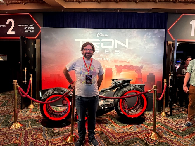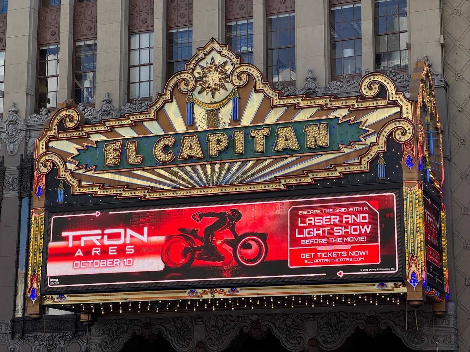 Arriving at the famous El Capitan Theatre on Hollywood Boulevard, I found the legendary movie house’s marquee lit up with the TRON: Ares key art.