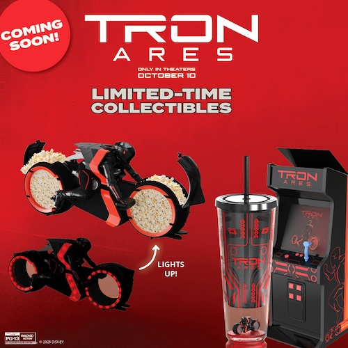 Their social media post also shows off a special TRON: Ares tumbler, and a classic arcade cabinet-themed collectible of some kind, likely another popcorn bucket.