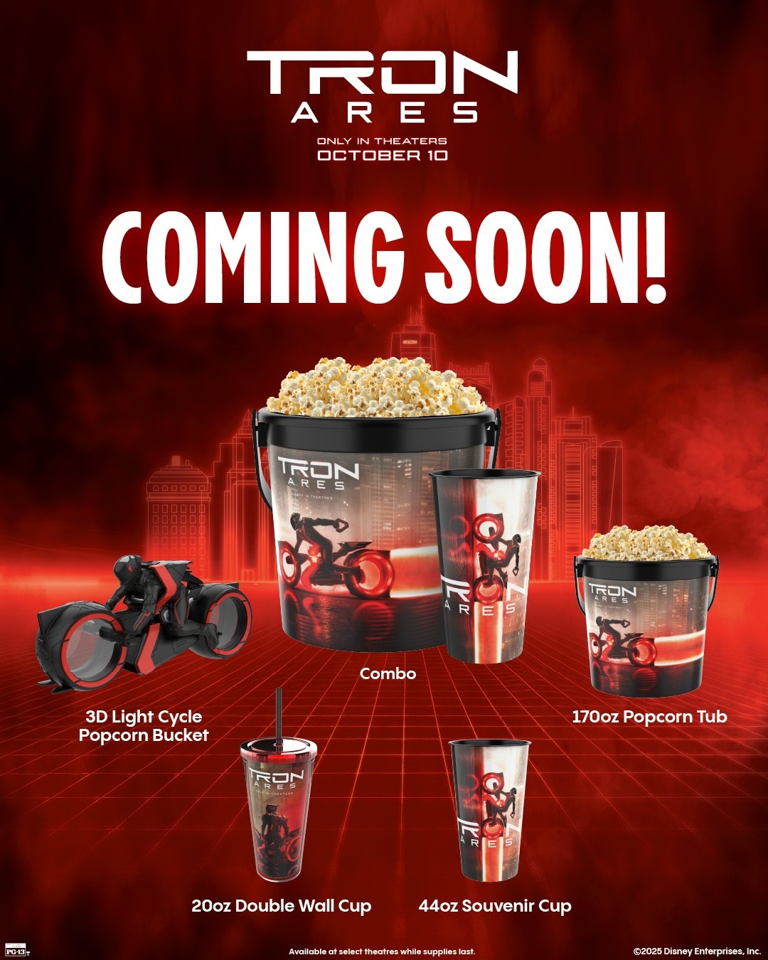 Their social media post also shows off a special TRON: Ares tumbler, and a classic arcade cabinet-themed collectible of some kind, likely another popcorn bucket.