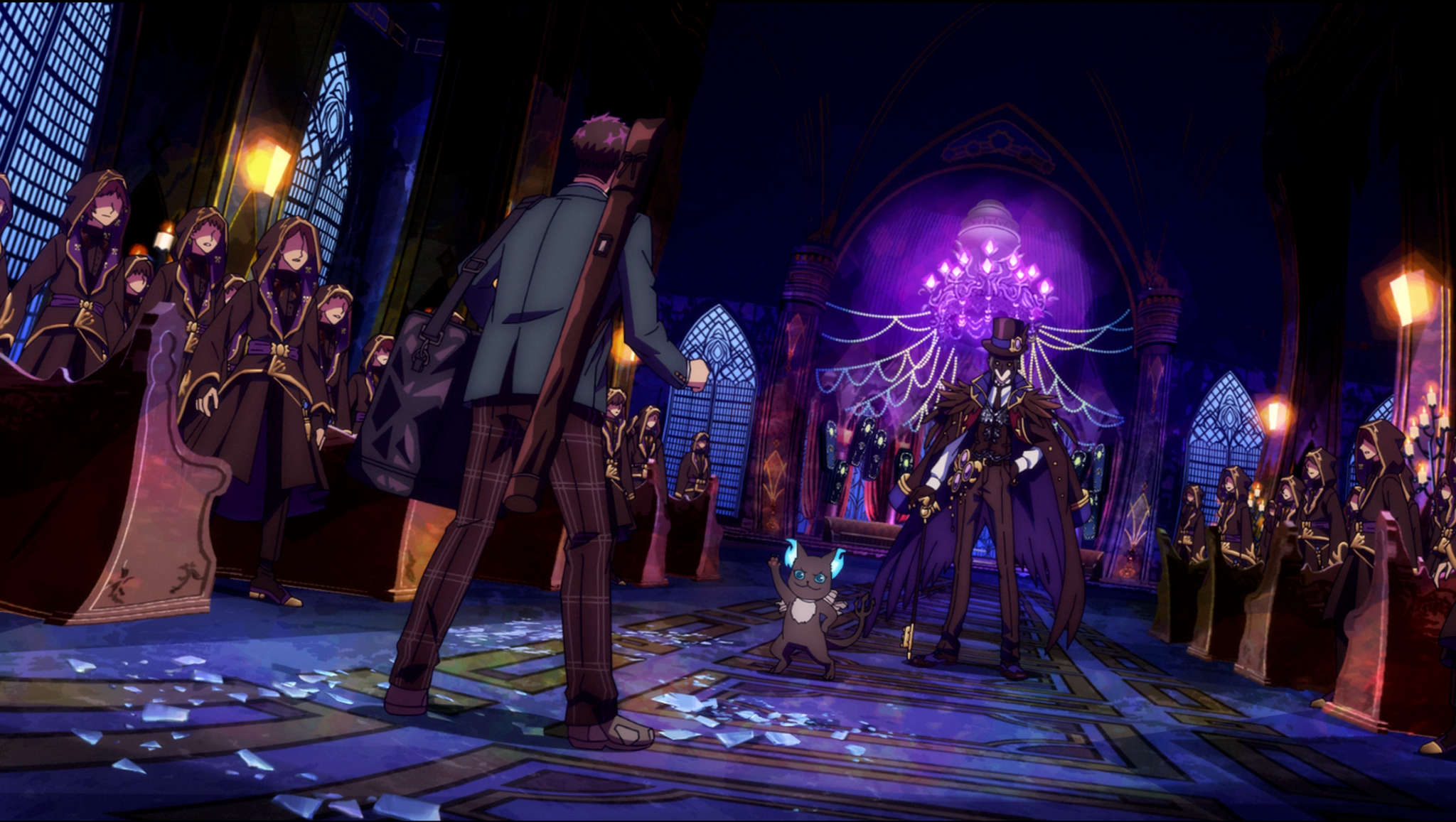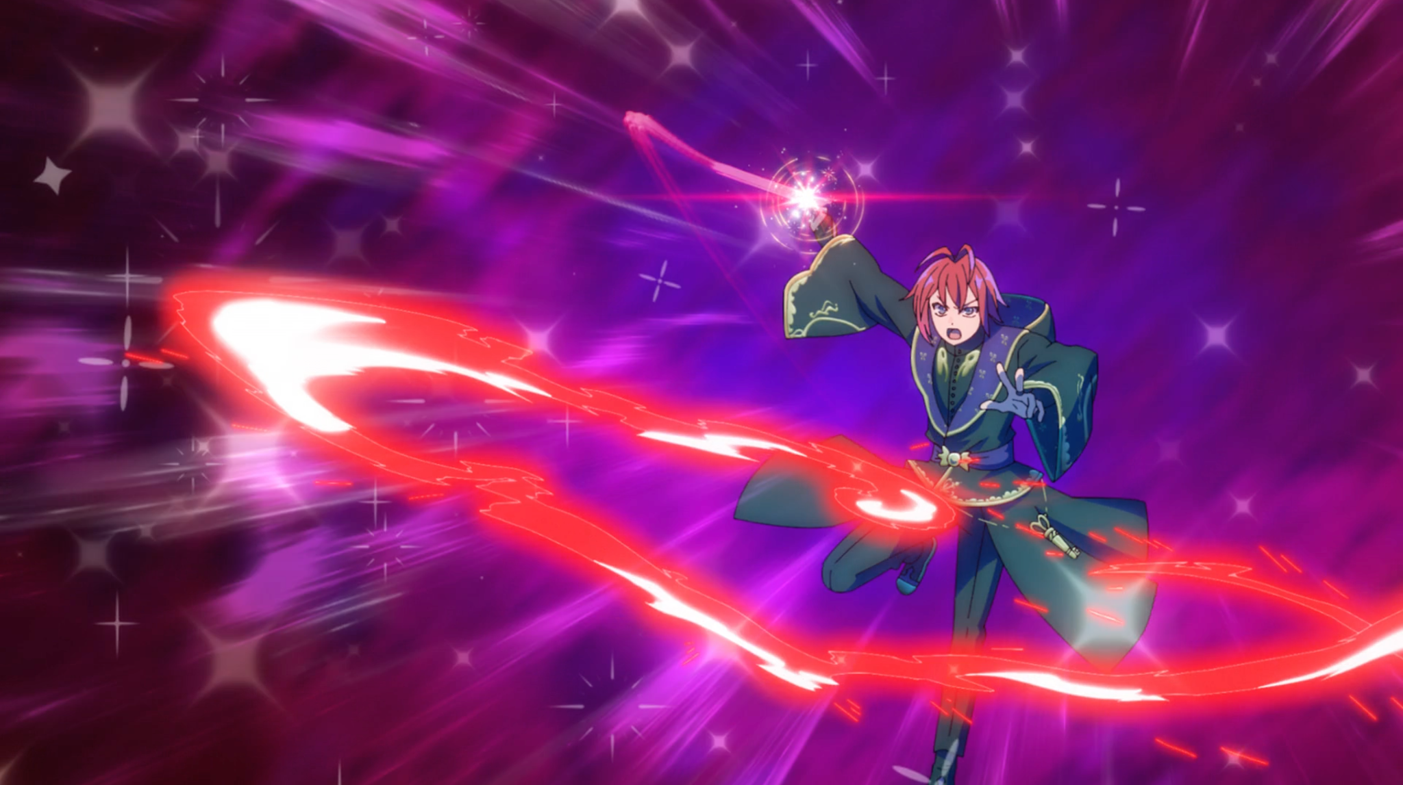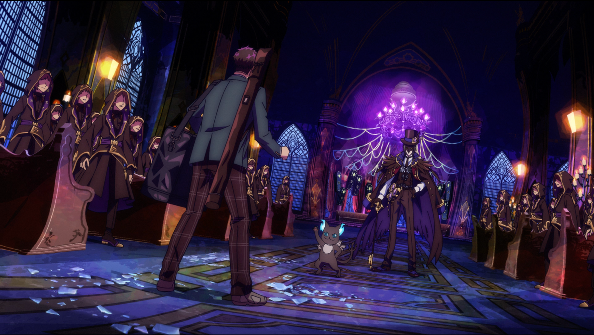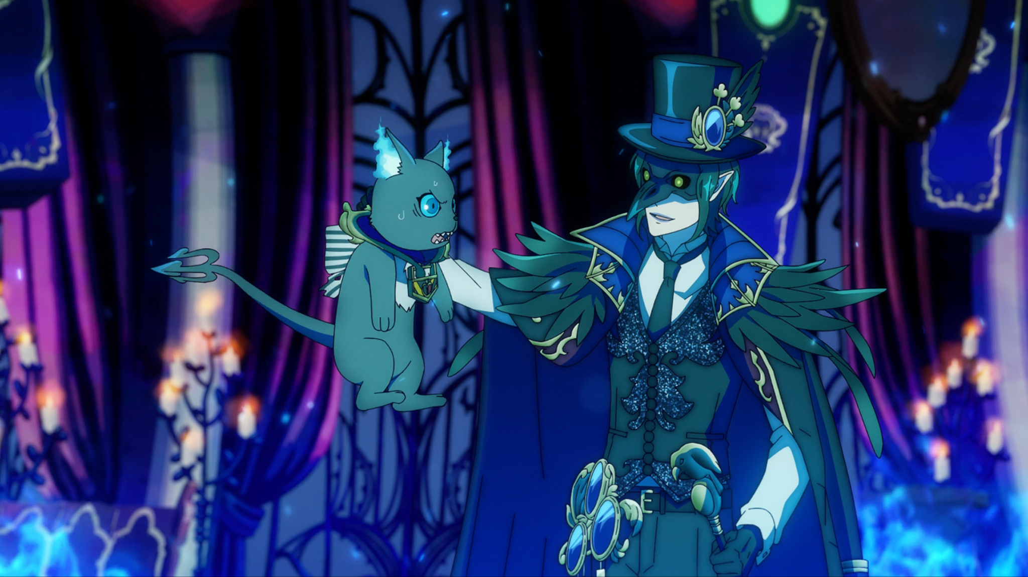 A glass window shatters as a cat-like creature with flaming blue ears and a forked tail leaps into the Mirror Chamber, announcing that if Yuken is leaving, he will gladly take his spot. He introduces himself as Grim (Noriaki Sugiyama/Ben Diskin), “a monster who’s destined for extraordinary magehood.” The students erupt in laughter at the concept, but Grim has the last laugh as he showcases his power, breathing blue fire throughout the Mirror Chamber, setting it ablaze!