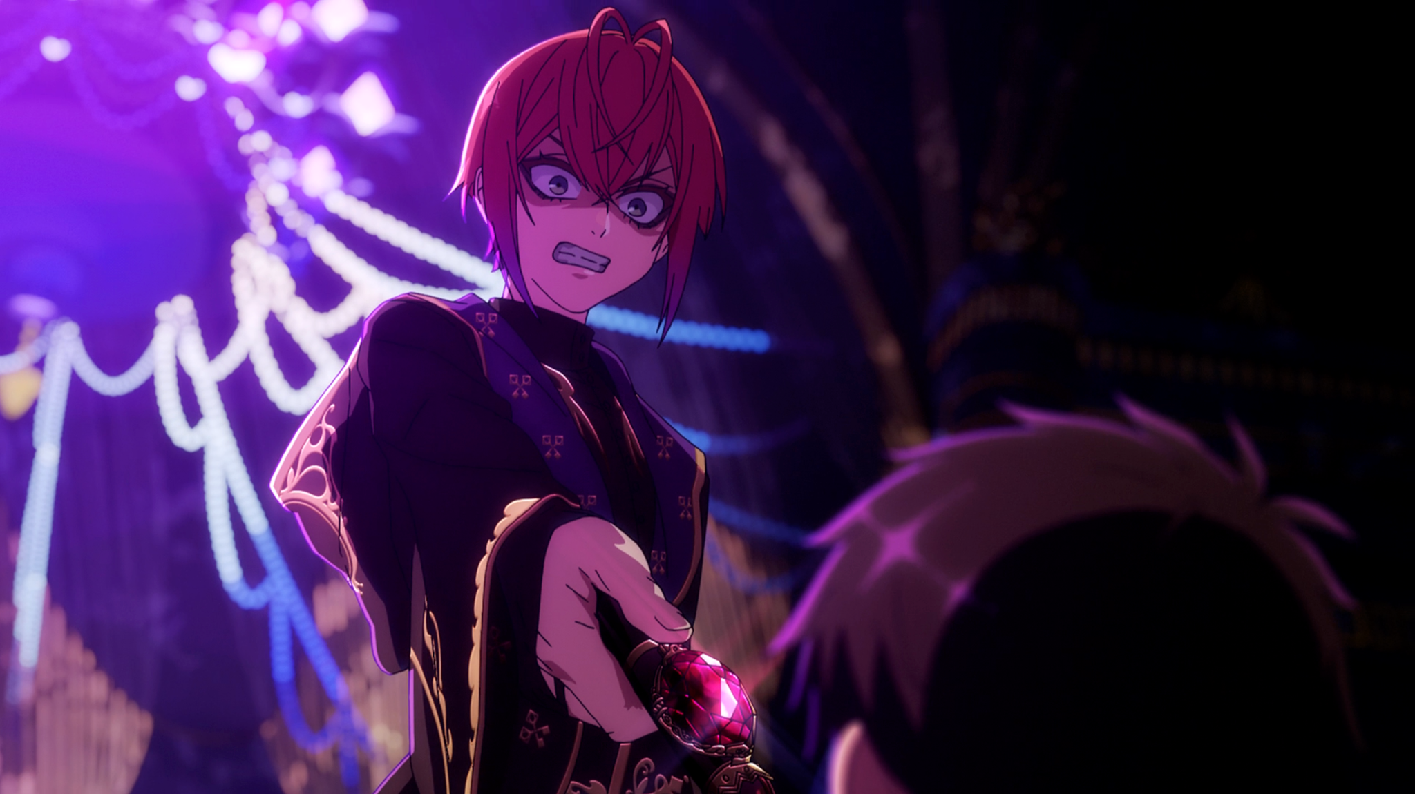 “You are here today because the Dark Mirror recognized in you a particular aptitude for magic,” Crowley reveals, announcing to the rest of the chamber that Yuken is the final student to arrive and orientation can now begin. But Yuken interrupts, claiming to now know how to do magic and insisting that he needs to go home for the tournament he’s worked so hard to lead his school to. Yuken tries to exit the Mirror Chamber, but Crowley stops him. He explains that students never refuse admission to Night Raven College, and the other students mock Yuken. “He’s making a mockery of our traditions,” Riddle Rosehearts (Natsuki Hanae/Paul Castro Jr.) furiously mutters.