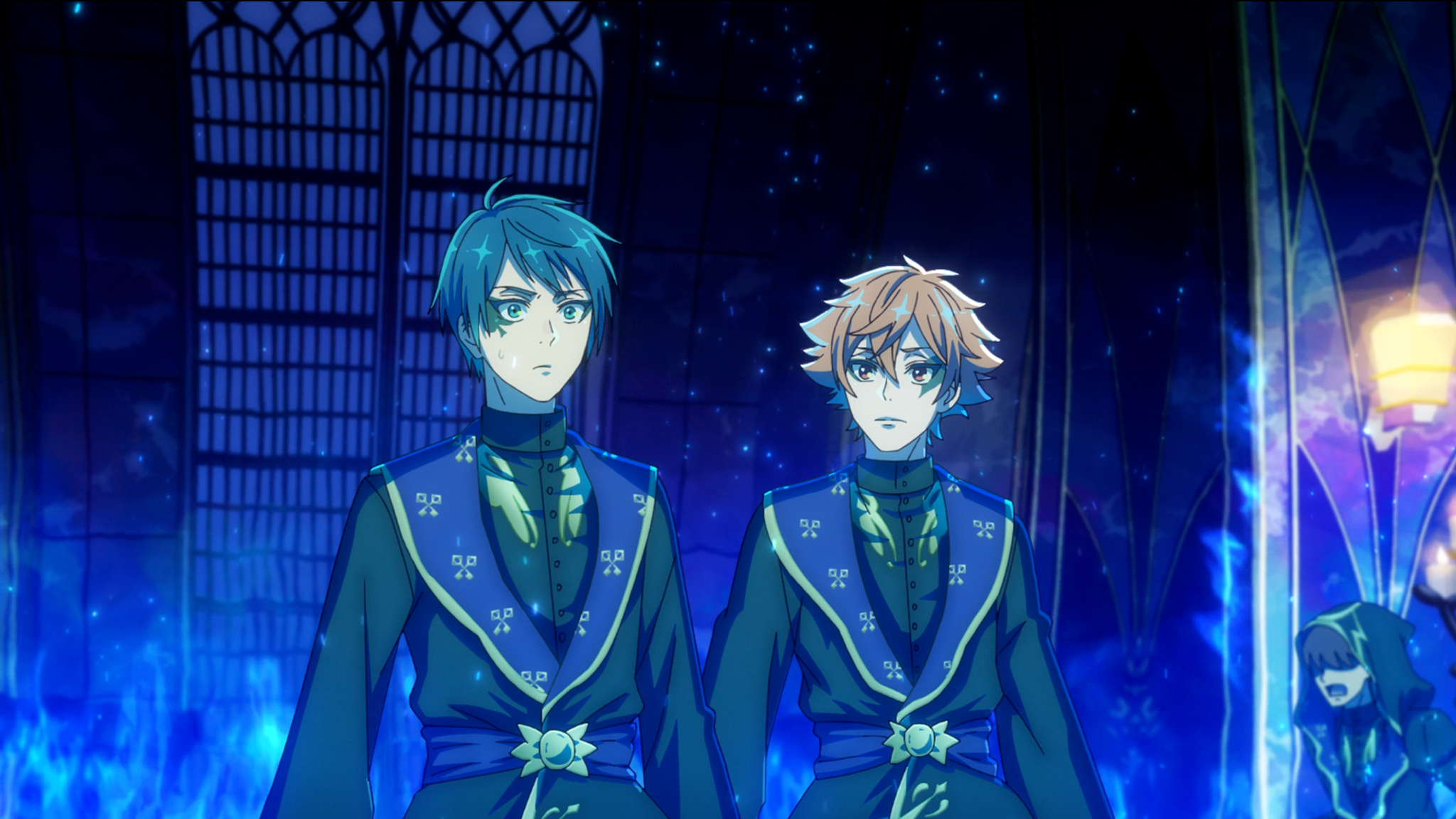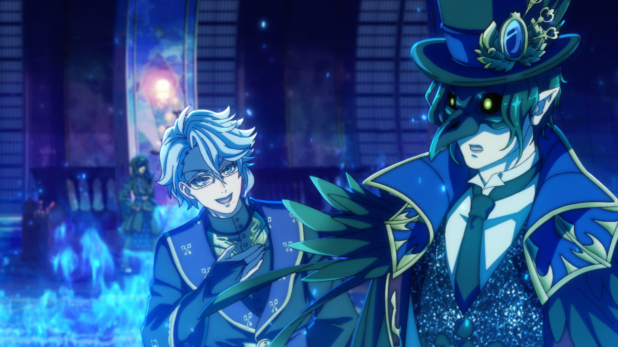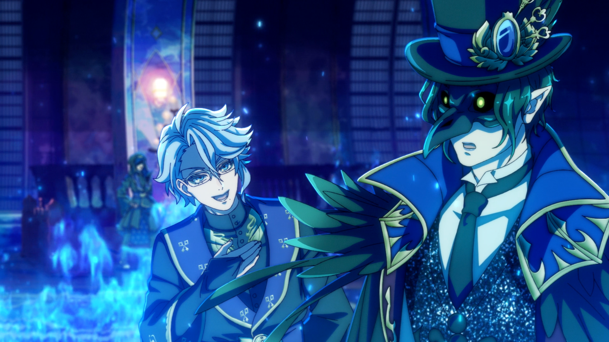 …and Jade Leech (Wataru Komada/Jonah Scott) and Floyd Leech (Nobuhiko Okamoto/Kellen Goff) of Octavinelle House. Their housewarden, Azul Ashengrotto (Atsushi Tamaru/Alejandro Saab), asks Crowley to let him handle Grim, calling him a “poor, unfortunate little soul,” as Ignihyde House housewarden Idia Shroud (Kōki Uchiyama/Khoi Dao) mocks him for being a suck up through a tablet he sent to the ceremony by proxy.