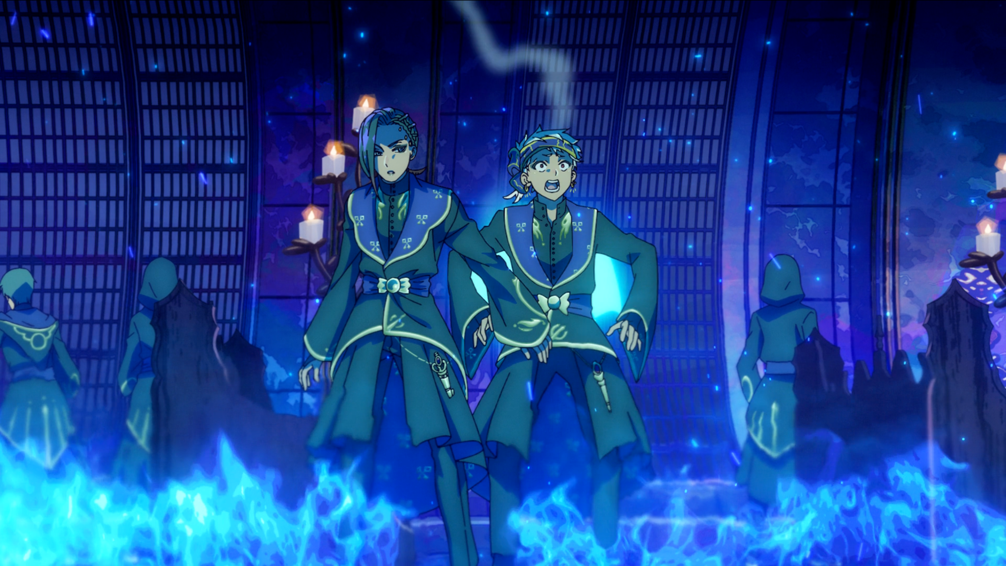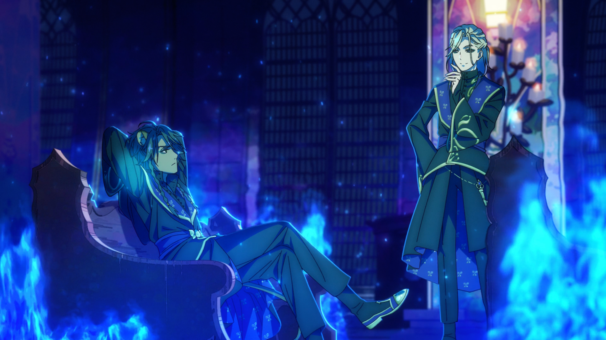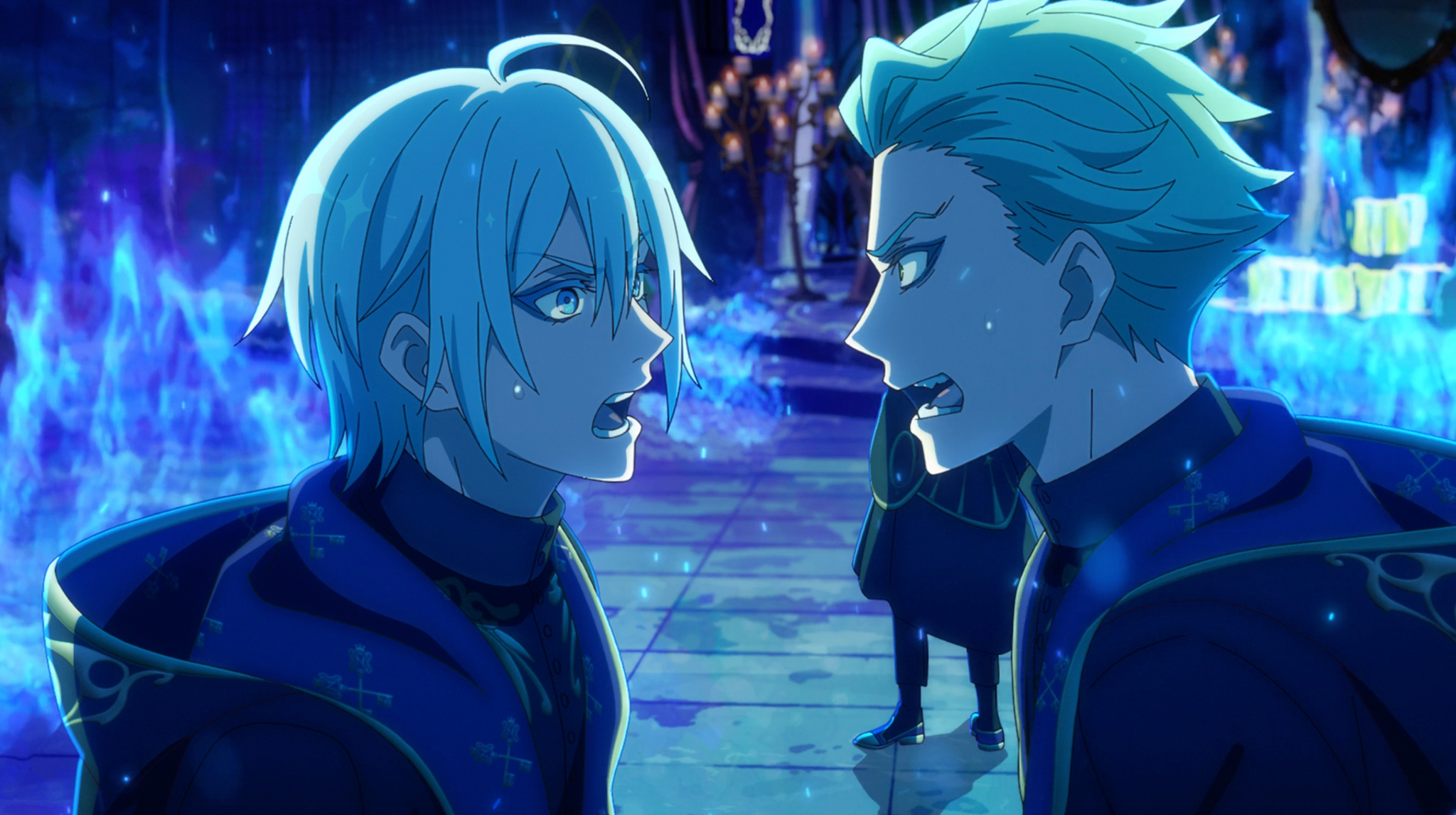 …and Jade Leech (Wataru Komada/Jonah Scott) and Floyd Leech (Nobuhiko Okamoto/Kellen Goff) of Octavinelle House. Their housewarden, Azul Ashengrotto (Atsushi Tamaru/Alejandro Saab), asks Crowley to let him handle Grim, calling him a “poor, unfortunate little soul,” as Ignihyde House housewarden Idia Shroud (Kōki Uchiyama/Khoi Dao) mocks him for being a suck up through a tablet he sent to the ceremony by proxy.