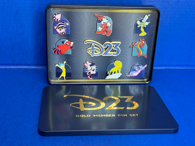 Inside are 10 pins, 9 depicting characters and a large D23 logo pin. All of the pins have a golden metallic border.