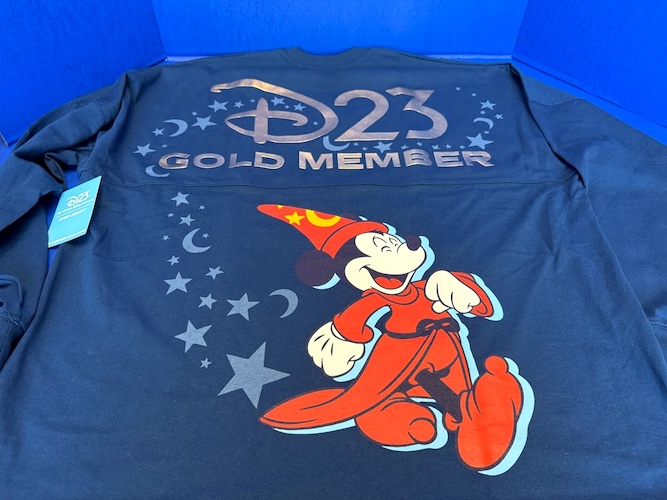 Spirit Jersey fans can show off their D23 Gold Member status in style. The logo on both the front and back look metallic, reflecting light and creating an eye-catching moment. A trend you’ll find throughout most of the 2025 membership options is Sorcerer Mickey decked all in red, which graces the back of this print. With the rest of the shirt in a steely blue hue, this will come in handy on less hot days at a Disney Park, or in a cold ballroom during a D23 event, like the upcoming Destination D23 at the Walt Disney World Resort.
