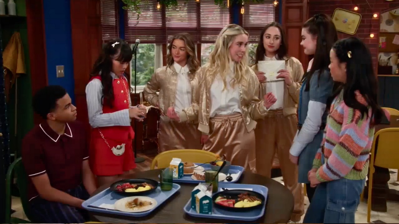 Wilson Hall Academy is buzzing when The Spotlights — a glittering all-girls club known for their matching gold outfits — make a rare appearance in the commissary. Joining the club would allow Vee (Kenzi Richardson) and Sophie (Jiwon Lee) to connect with their idol, Millie Eyelash, who was part of the sisterhood during her time as a student. Britney (Faith Hedley) is starstruck when the group looks her way. The leader, Megan (Jenna Davis), offers her an invitation to their meet and greet, the first step in the initiation process. As the First Year to Watch winners, Vee and Sophie also get invites. Britney warns them that not every First Year to Watch winner makes it in.