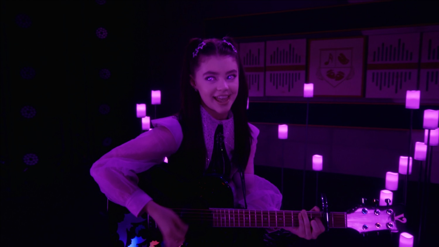 Taking the advice to heart, Vee returns to the darkened stage. She asks Sophie and Elijah to light a few candles, and the electrician adds lanterns for safety. As Vee begins to sing an acoustic version of “Making This My Moment," the candles flare purple and the scene shifts into a soft montage of her memories at Wilson Hall. Her eyes glow purple without any fritz or fear, just emotion, and it wows the judges