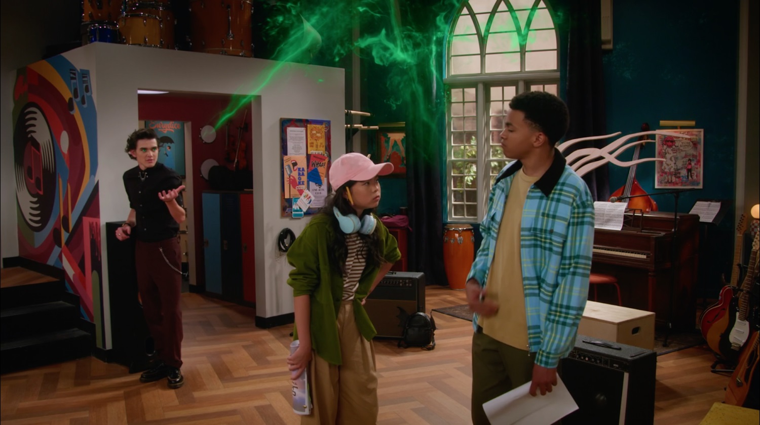 At the cafeteria, Demi’s now working kitchen duty as Lucien saunters in. Britney spots him and instantly swoons, pretending to be her “twin sister Sue" before sprinting off to change. Dean Merriweather greets the “new exchange student from Mirroria," while Vee beams that he’ll be sticking around — at least until the Millie Eyelash concert. Elijah looks less thrilled.