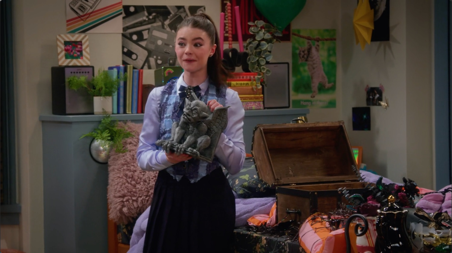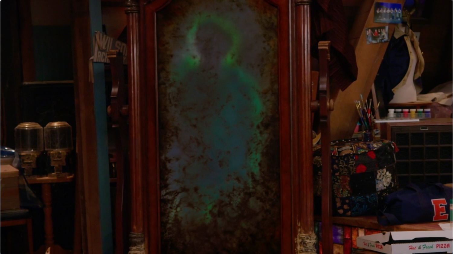 Up in the attic, Elijah (Shaun Dixon) practices his Van Helsing fighting techniques when Vee and Sophie (Jiwon Lee) stop by to check on him. The bell rings, and Elijah rushes off — he has to prepare for his solo in the upcoming interpretive dance performance. Back in the dorm, Demi tidies up, only to realize that Stoney has mysteriously moved from the shelf to the opposite side of the room. He tosses the gargoyle in the trash, but moments later, it reappears on the mantel, staring right at him.