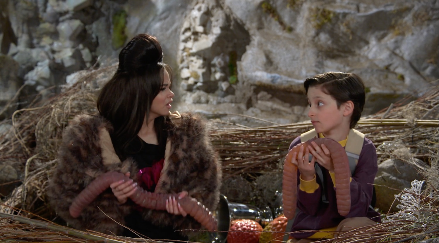 Billie goes to the lair where Milo (Max Matenko) is browsing a catalogue of wizard world pets after finding out he can’t get a monkey. Billie uses Wiz M.D. (Patrick Bristow) to try to determine what’s wrong and learns that she may have Wizfluenza, the cure for which is some dragon scale soup. She ventures through the door to the wizard world to find one, unaware that Milo follows her.