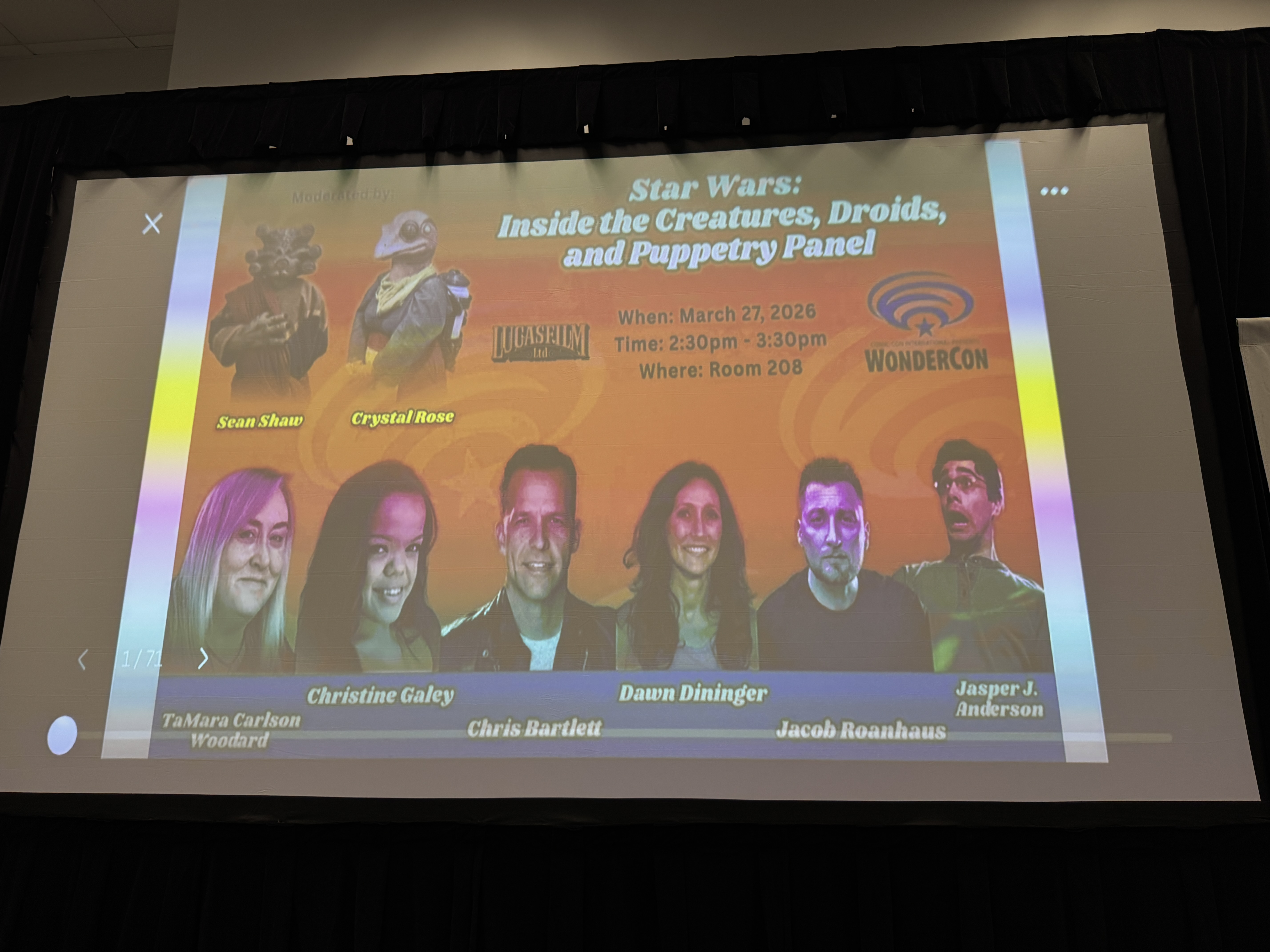 The first panel I attended during WonderCon 2026 was called "Star Wars: Inside the Creatures, Droids, and Puppetry." I found this to be really fascinating, and it featured a lot of folks who had actually worked on the Disney+ Star Wars series, not to mention puppeteering Grogu himself in his upcoming movie The Mandalorian and Grogu-- not to mention his hilarious appearance interacting with host Conan O'Brien during this year's Academy Awards ceremony. One very funny side note about this panel is that for the first 15 minutes or so, I thought someone in the audience in front of me was snoring, but it turned out to be an electronic Rancor toy that was on the stage next to the panelists.