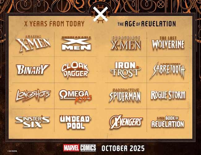 - Crossover tie-ins will include Amazing X-Men, Unbreakable X-Men, Binary, Cloak Or Dagger, Longshots, Omega Kids, Sinister’s Six, Undead-Pool, Expatriate X-Men, The Last Wolverine, Iron & Frost, Laura Kinner: Sabretooth, Radioactive Spider-Man, Rogue Storm, X-Vengers, and X-Men: Book of Revelation. You can see the logos for those titles in the image below.