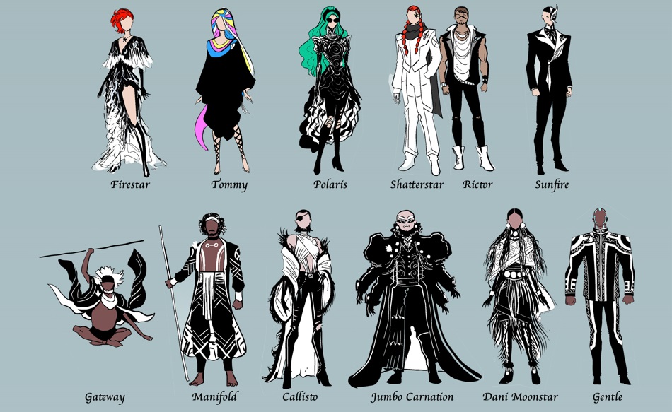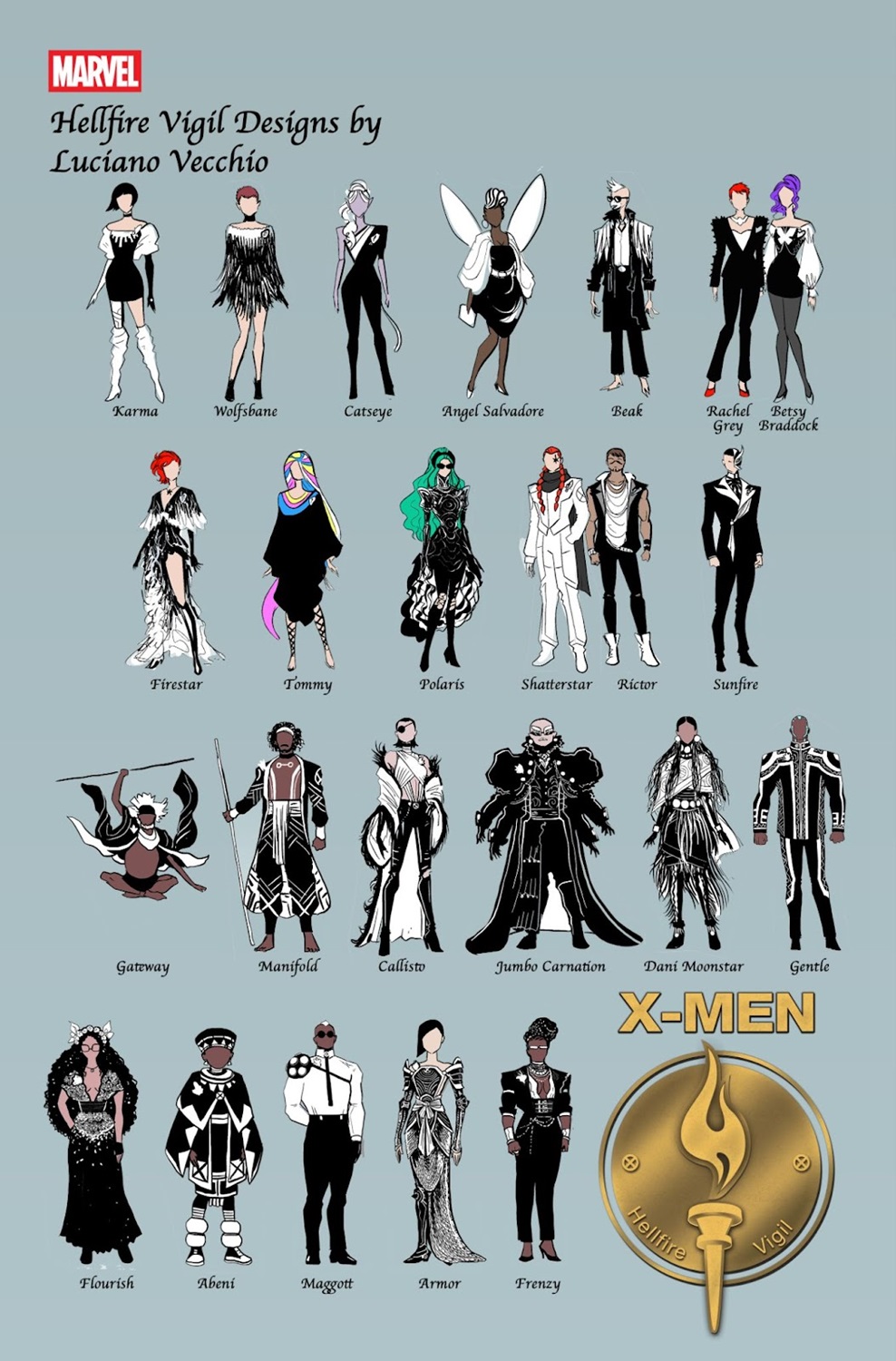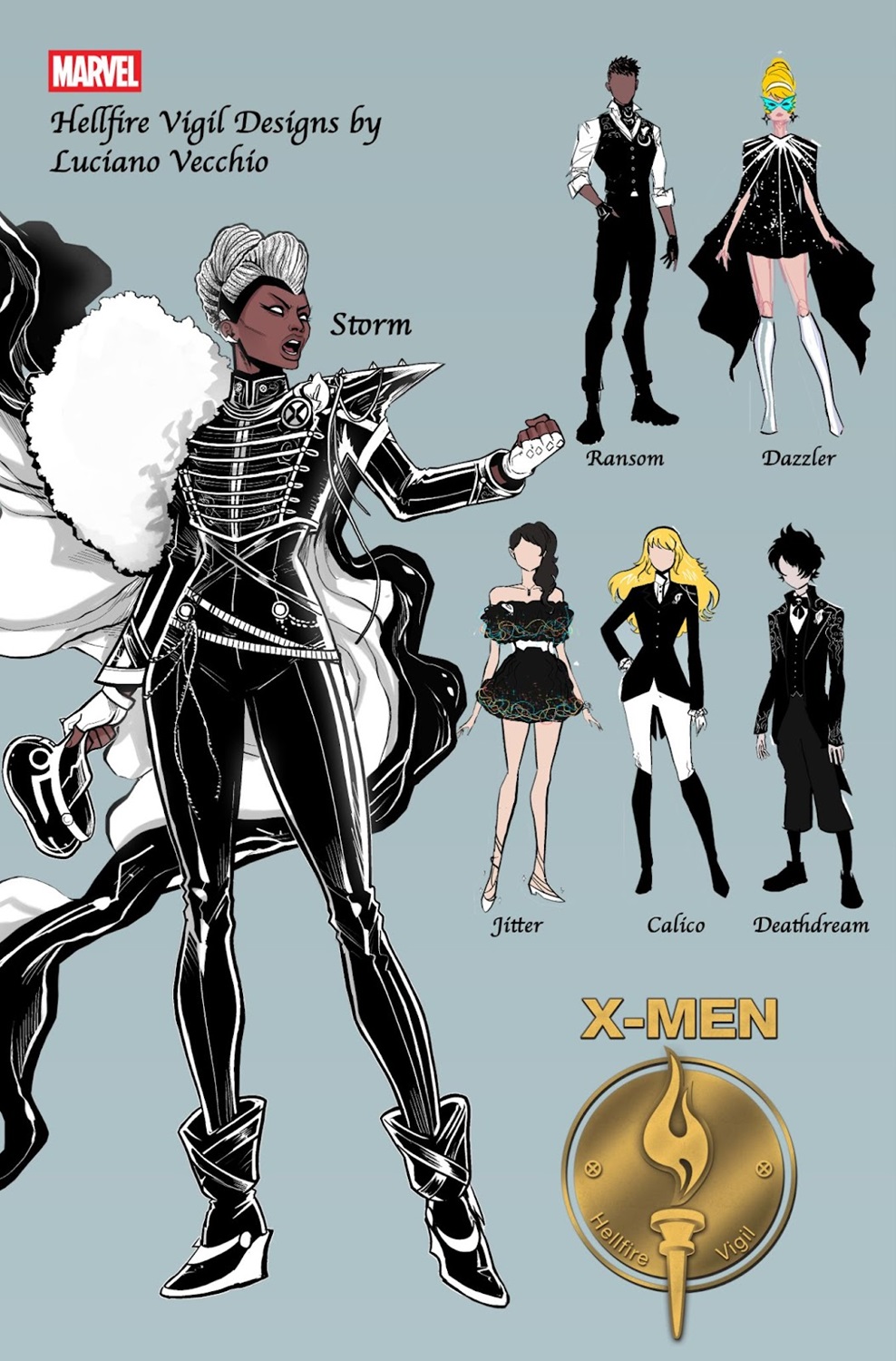 - Luciana Vecchio: “This is a Vigil, not a Gala, so these looks are striking, but more solemn, less flashy yet still fun, that reflect each character’s history in a Post-Krakoan way. Unlike previous years where I focused on individual designs one at a time, here I worked in bunches at once to create a cohesive look while keeping singularities. I found inspiration by limiting myself to work with mostly black and white, and figuring out what that sparked in each character’s iconography. I started with Stom, following Murewa’s directives and adding some twists of my own, and then worked on the list of characters he wanted to appear in his segment. I did the same with the Outliers and Gail, and then I added characters from my own list of who I wanted to show up."