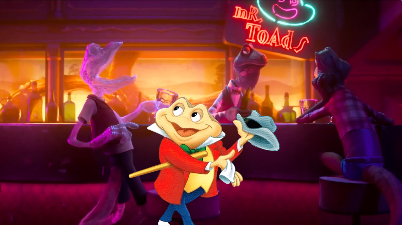 In the reptile speakeasy, the bar has a neon sign declaring it “Mr. Toad’s.” Also immortalized is the face of J. Thaddeus Toad, the central character in “The Wind in the Willows” segment of The Adventures of Ichabod and Mr. Toad, which inspired the classic Disneyland attraction Mr. Toad’s Wild Ride.