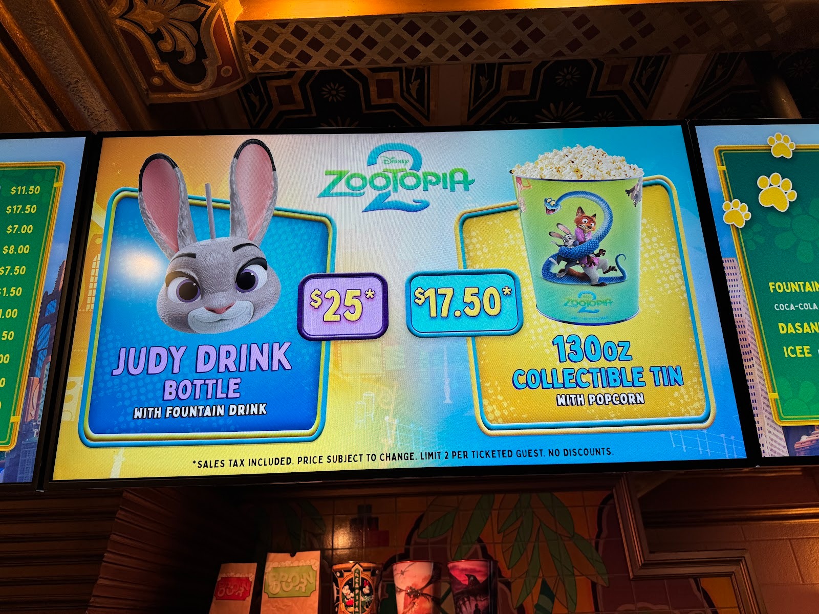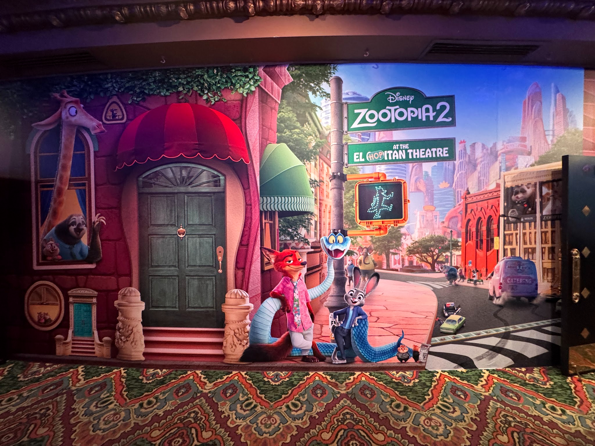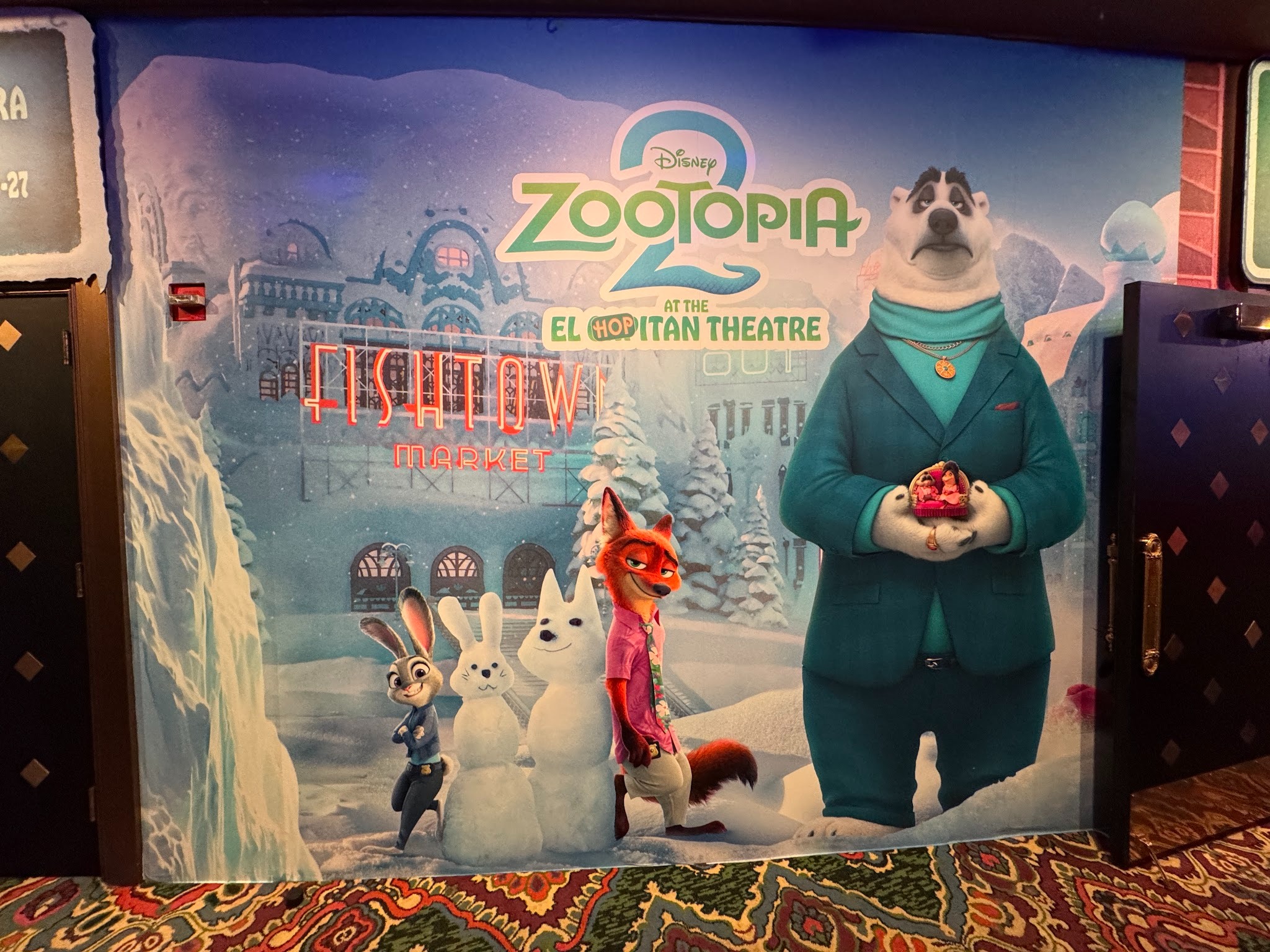 Inside the theater itself, more decor is staged further immersing moviegoers into the Zootopia 2 atmosphere, with the upper balconies featuring billboards and decor themed to locales in the movie - Tundra Town and Marsh Market.
