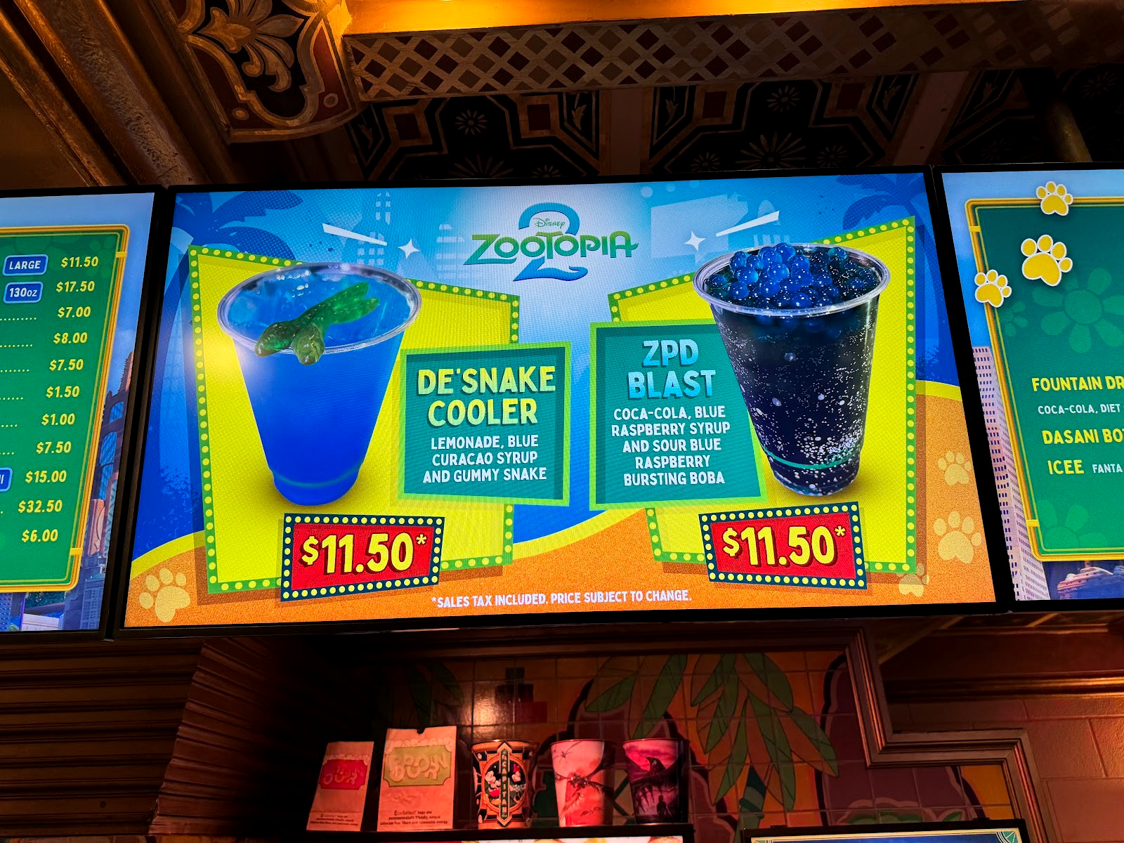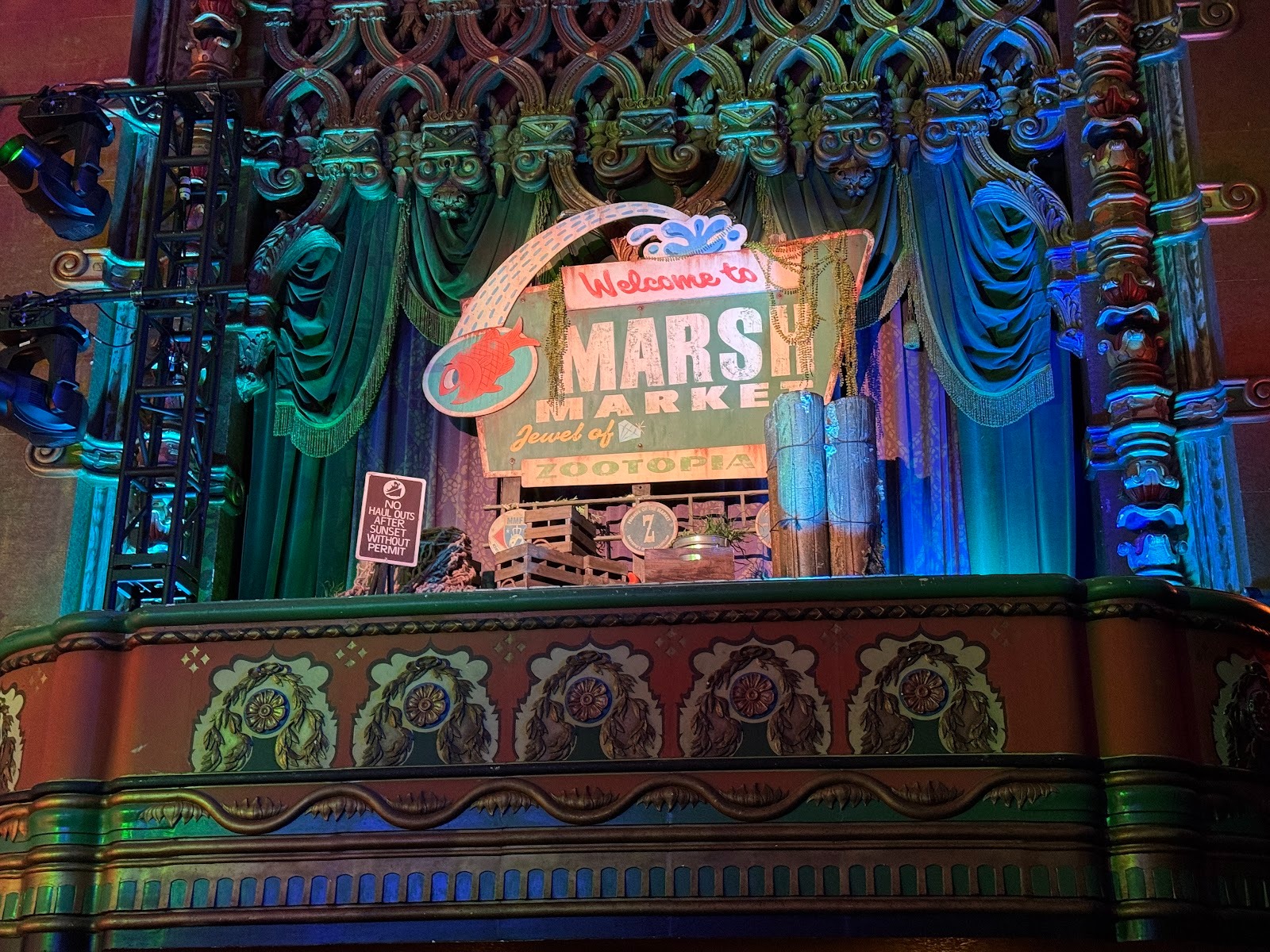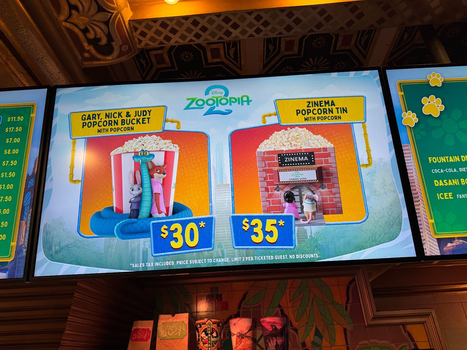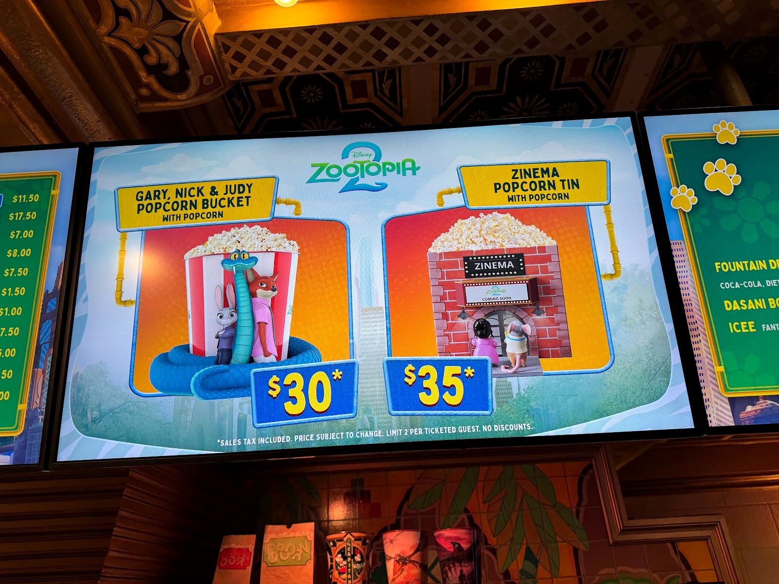 Inside the theater itself, more decor is staged further immersing moviegoers into the Zootopia 2 atmosphere, with the upper balconies featuring billboards and decor themed to locales in the movie - Tundra Town and Marsh Market.