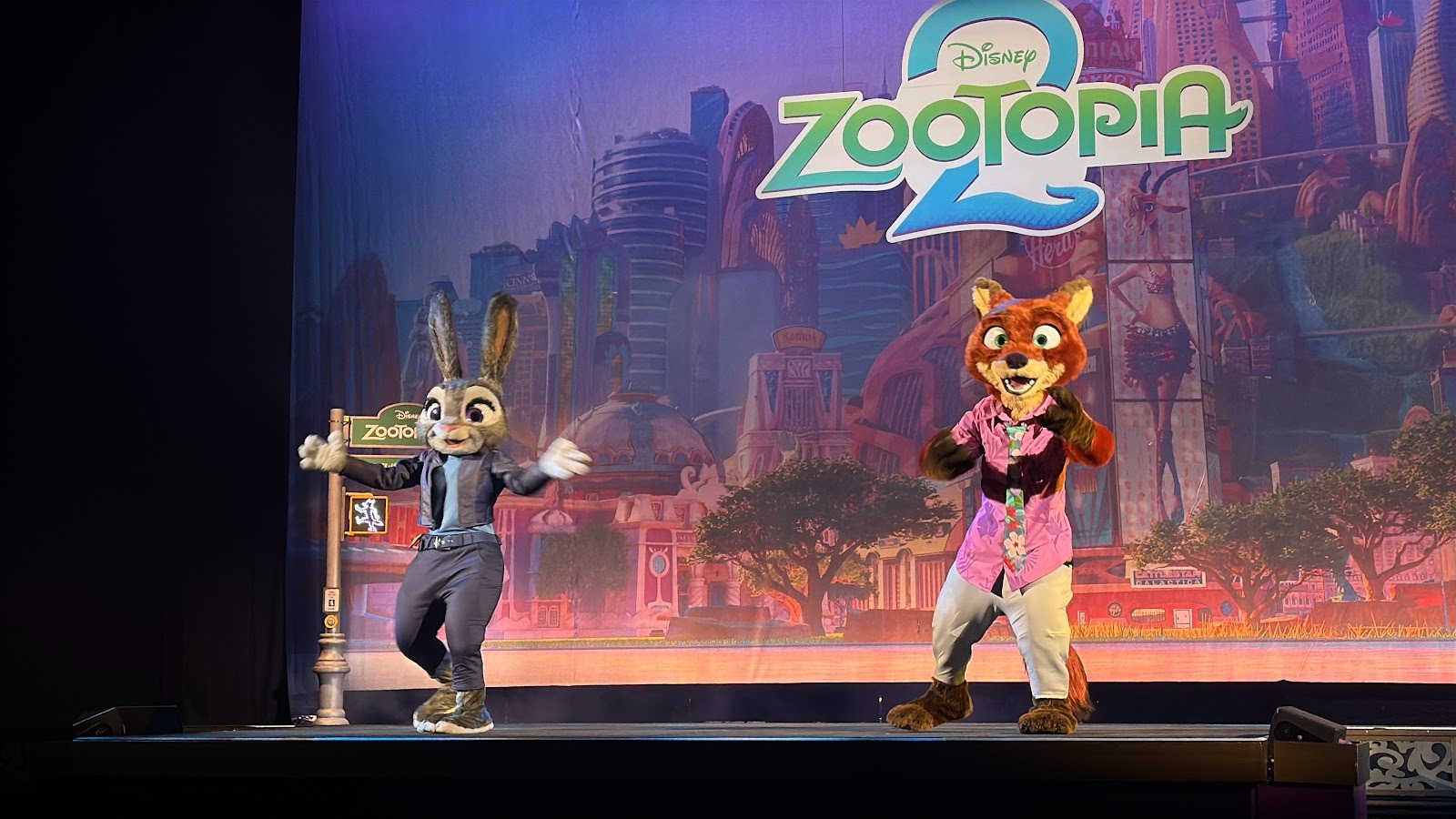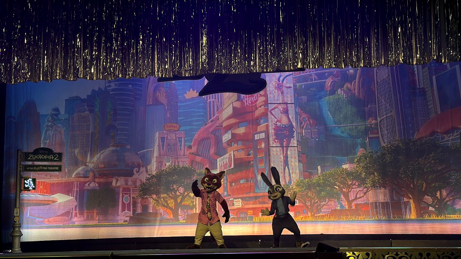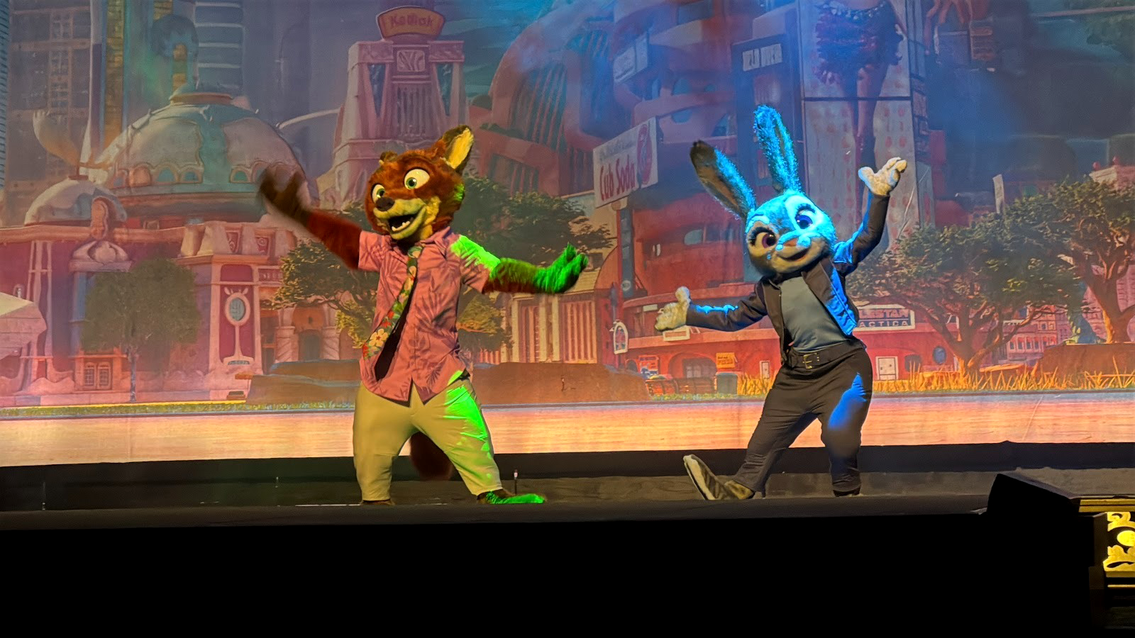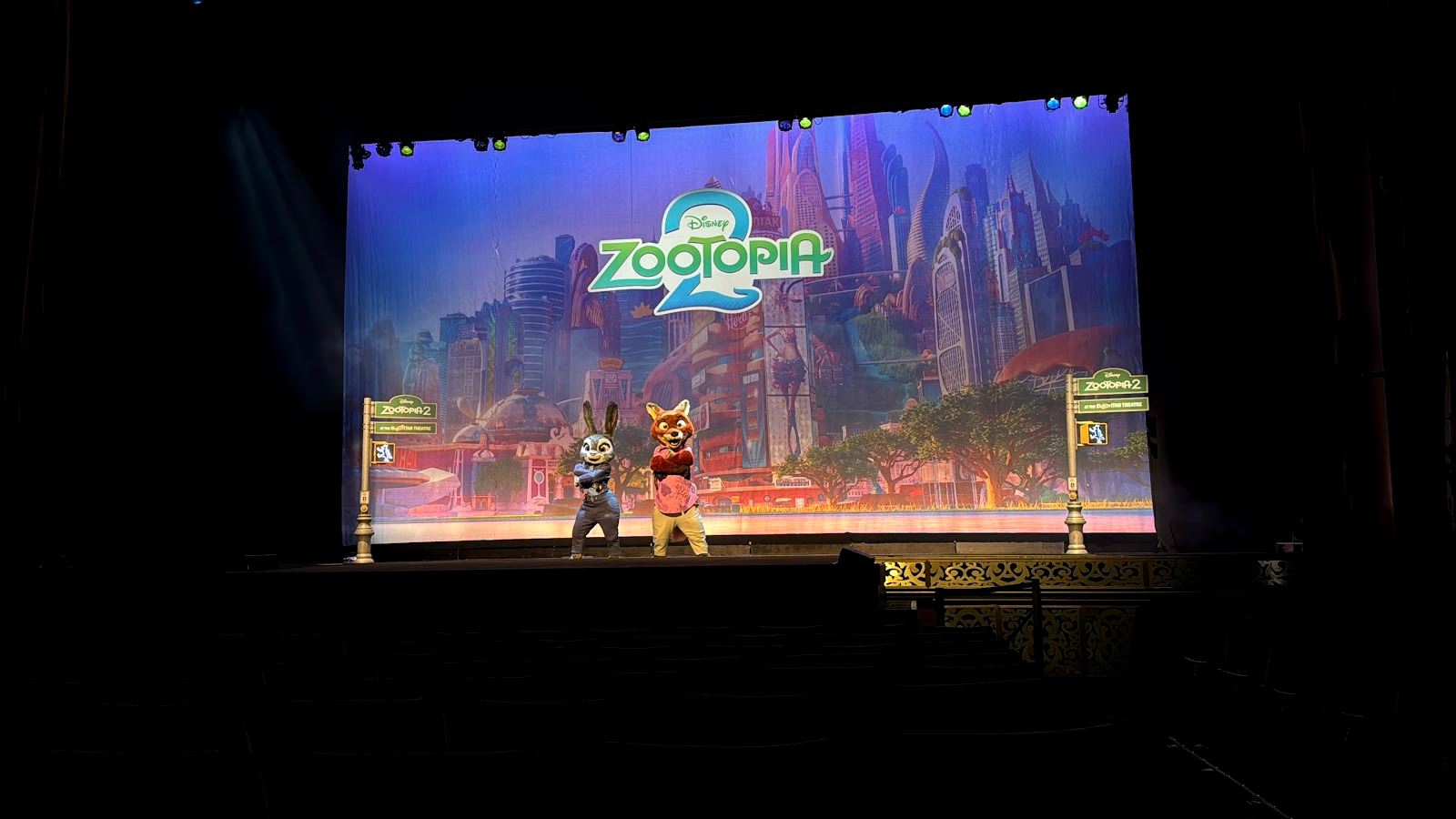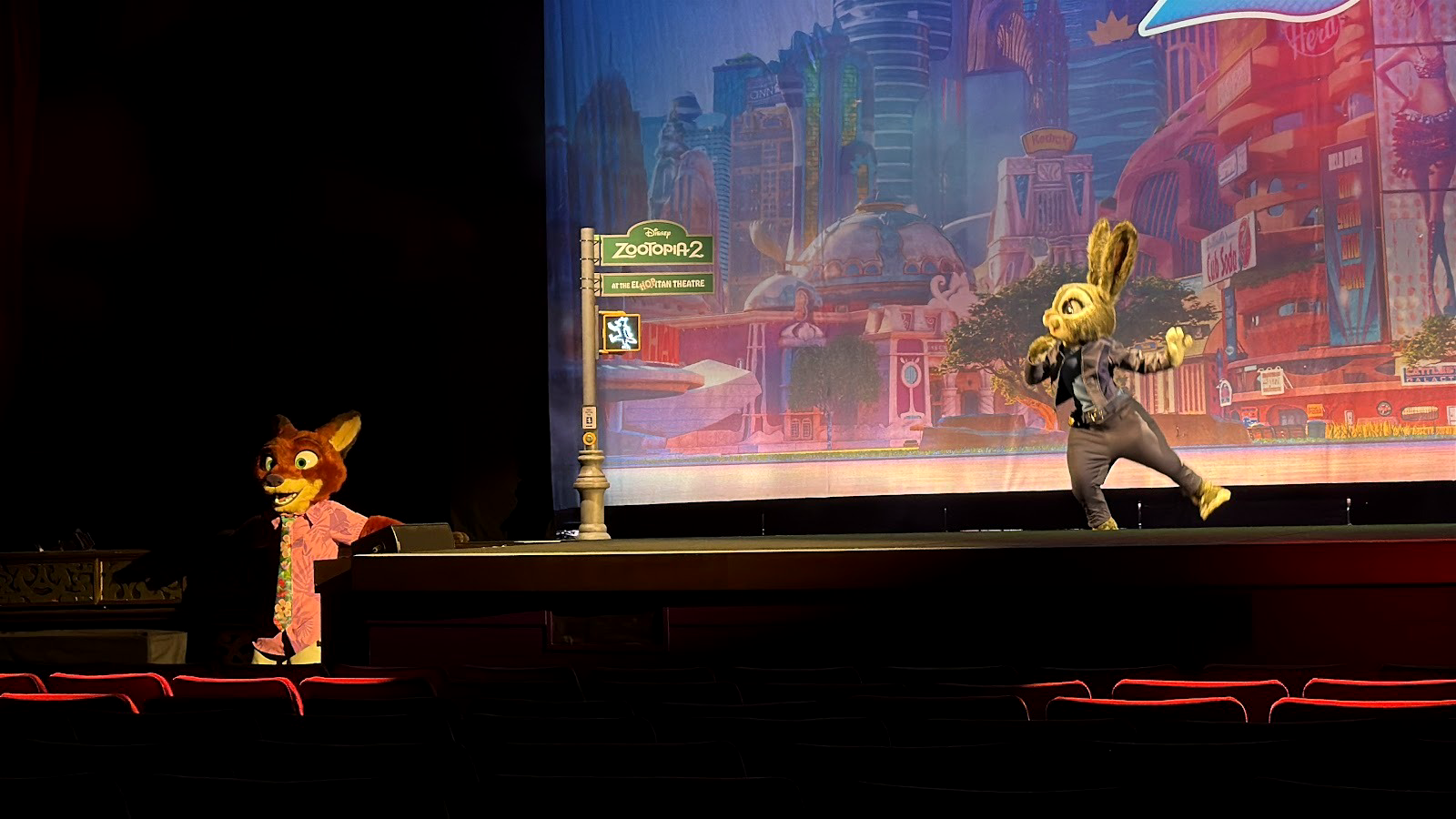 A special pre-show is still in place featuring the new song from the film, “Zoo” as performed by Shakira, who reprises her role as Gazelle in the new movie. Nick Wilde and Judy Hopps appear onstage, dancing around to the tune, before the movie begins.