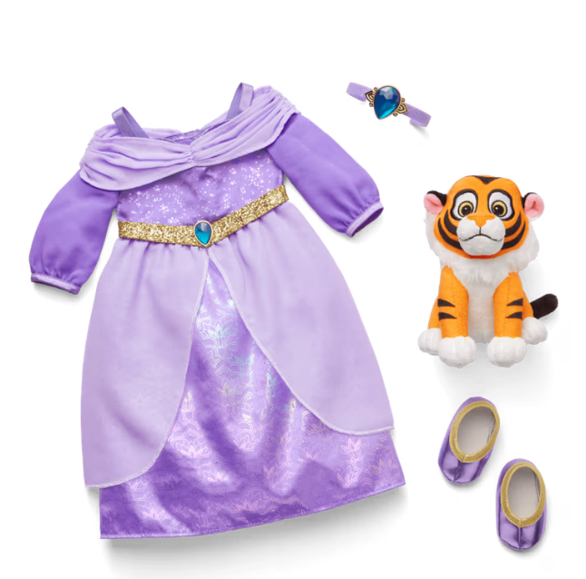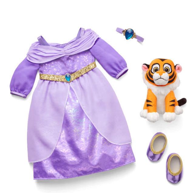 - A separate accessory pack includes Jasmine’s regal lilac satin dress, a sparkly headband, and matching purple slippers.