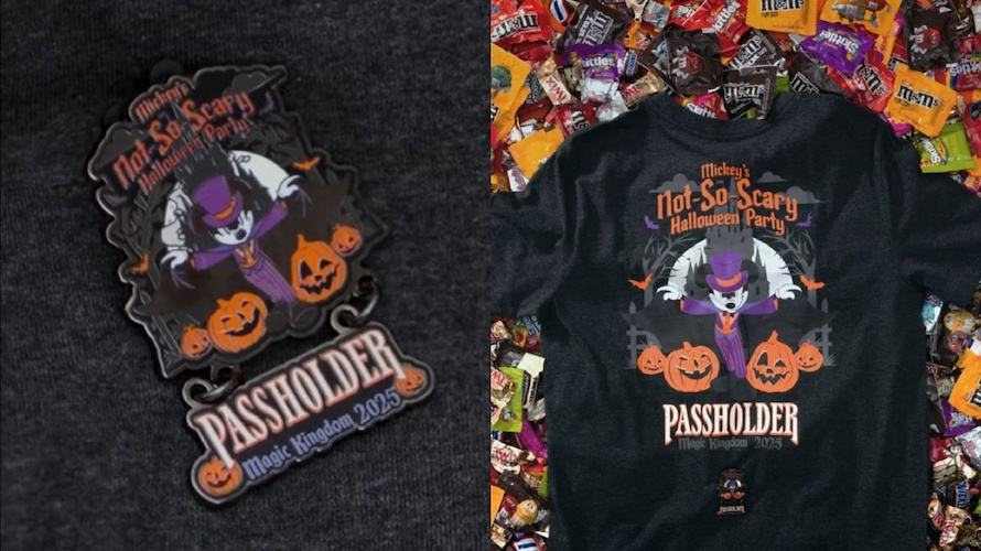 Thus far, Walt Disney World has previewed two merchandise items for Mickey’s Not-So-Scary Halloween Party that will be exclusive to Annual Passholders. Passholders will be able to commemorate their visit to this year’s eerie event with a themed shirt and pin – both available to purchase at the Emporium on Main Street, U.S.A.