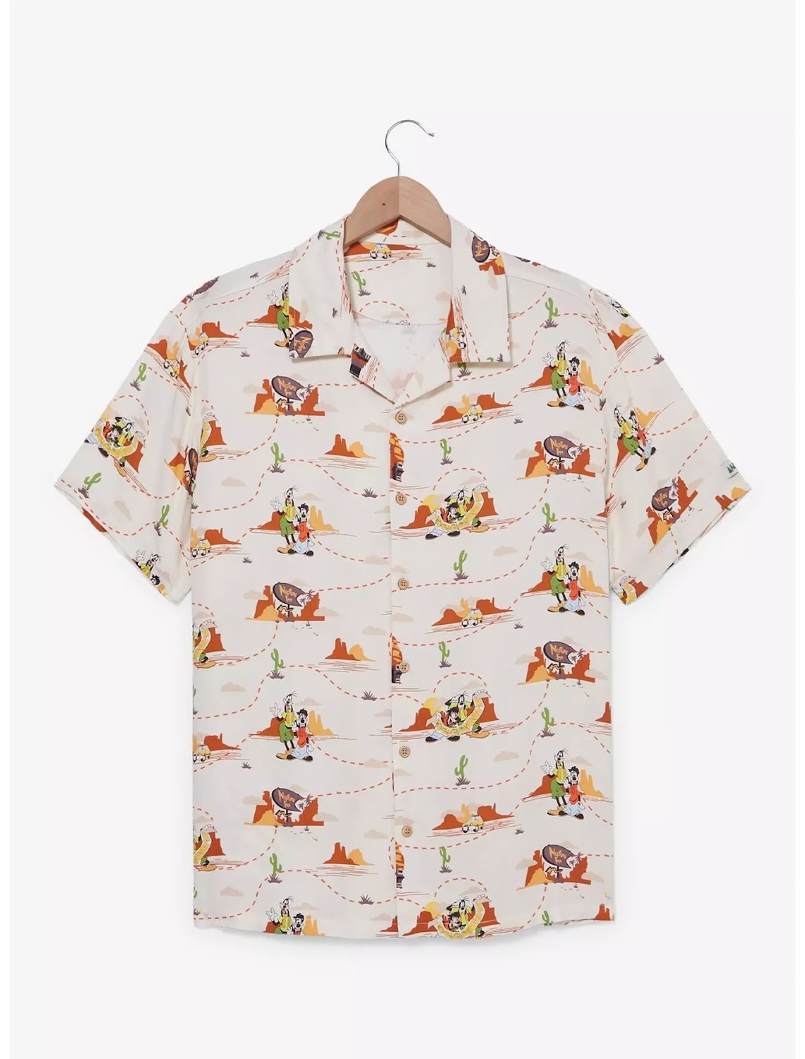 Disney A Goofy Movie Road Trip Allover Print Woven Button-Up - BoxLunch Exclusive ($35.92) - “Get ready for your next road trip in this Goofy Movie button-up! Featuring an allover print of Max and Goofy with destinations from their trip, this shirt includes a button front, perfect for wearing multiple ways."