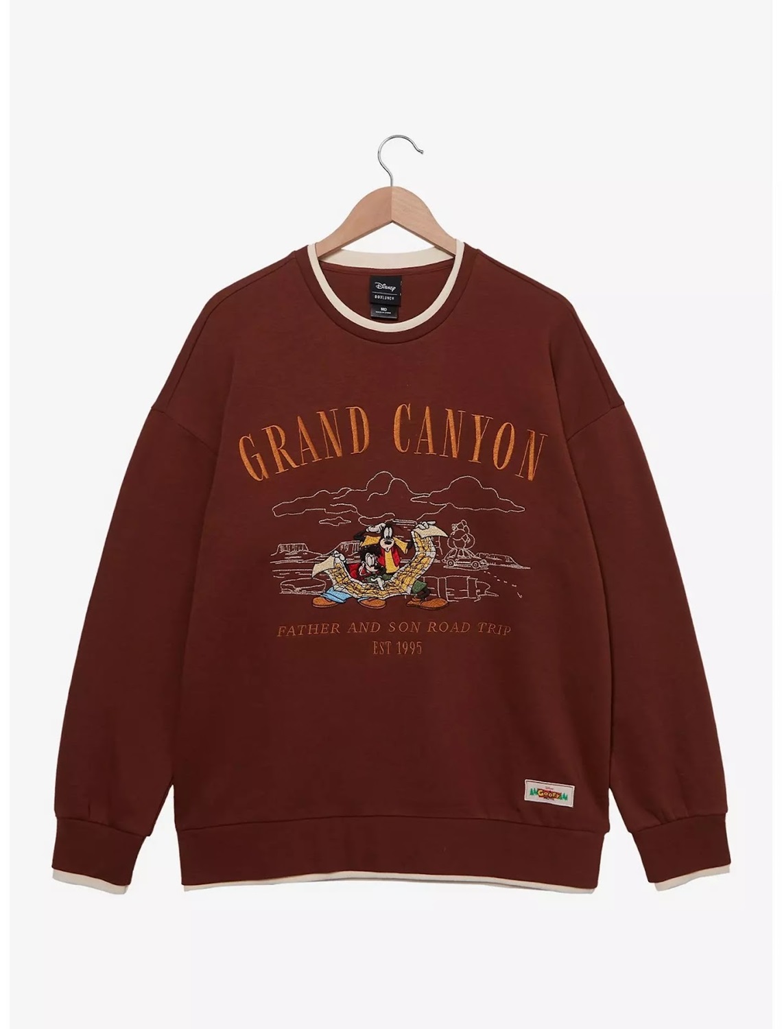 Disney A Goofy Movie Grand Canyon Crewneck — BoxLunch Exclusive ($59.90) - “Stay comfy and cute on your next road trip! With embroidered details, this Goofy Movie crewneck features Goofy and Max inspecting a map below ‘Grand Canyon’ lettering, accented with a label above the hem."