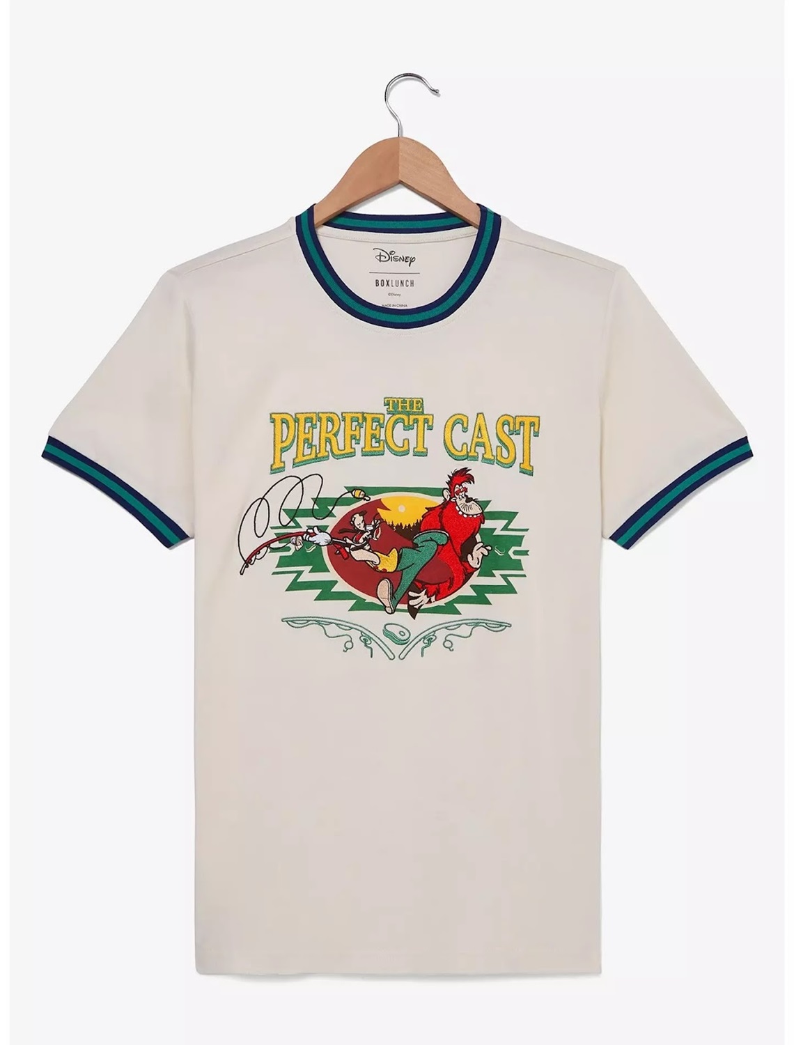 Disney A Goofy Movie The Perfect Cast Ringer T-Shirt - BoxLunch Exclusive ($32.90) - “Spend the day fishing in style! Featuring an embroidered design of Goofy and Bigfoot from A Goofy Movie beneath ‘The Perfect Cast’ lettering, this shirt includes ringer-style hems for an added touch."