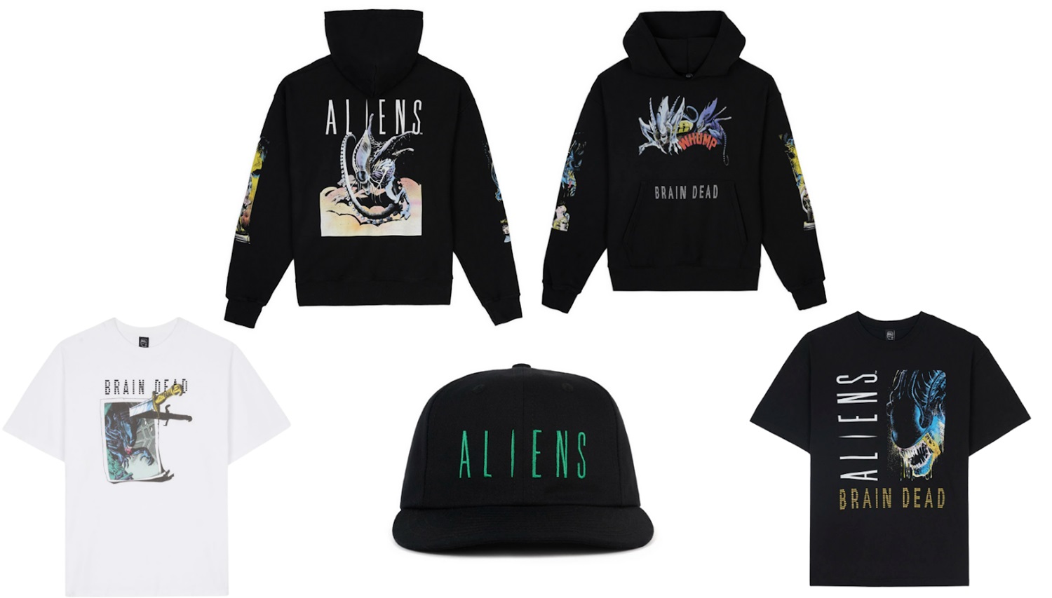 - The Brain Dead x Aliens collection features two t-shirts, a hat, and a sweatshirt.