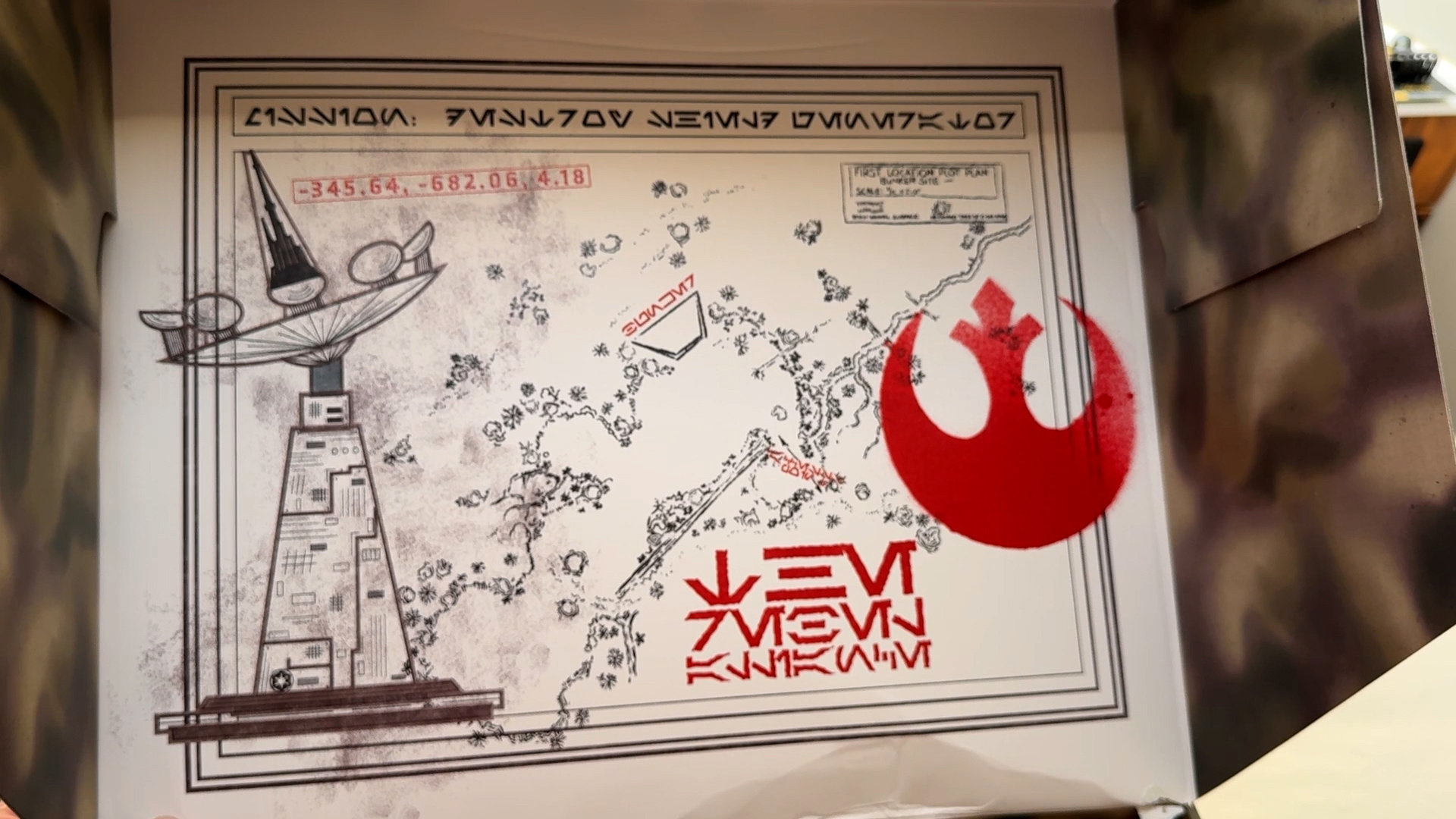 As a big Star Wars geek, I was particularly impressed with the artwork on the inside of the box cover, which depicts a map of the Imperial bunker on Endor. In the fictional Star Wars alphabet called Aurebesh, the text reads "Mission: Destroy Shield Generator" and on the bottom it says "Rebel Alliance."