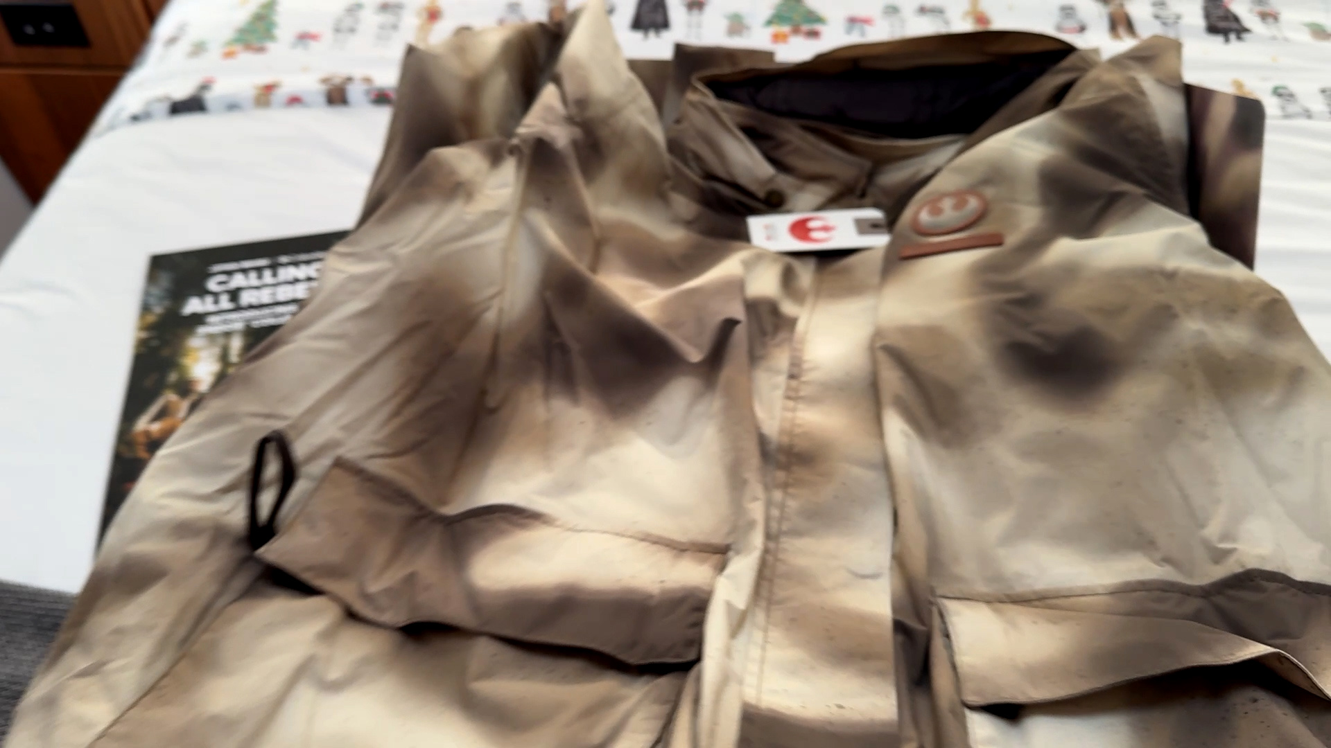 The first-- and probably most jaw-droppingly impressive-- item we received from the collection is the General Han Solo Trench Coat ($600), which comes complete with authentic details such as the Rebel Alliance insignia and Aurebesh messages, was inspired by the costume that Harrison Ford wore during his scenes on Endor. There's also an Omni-Heat Infinity vest on the inside, and a custom "gold Rebel thermal-reflective pattern" (see image below) that is sure to dazzle anyone who gets a glimpse.