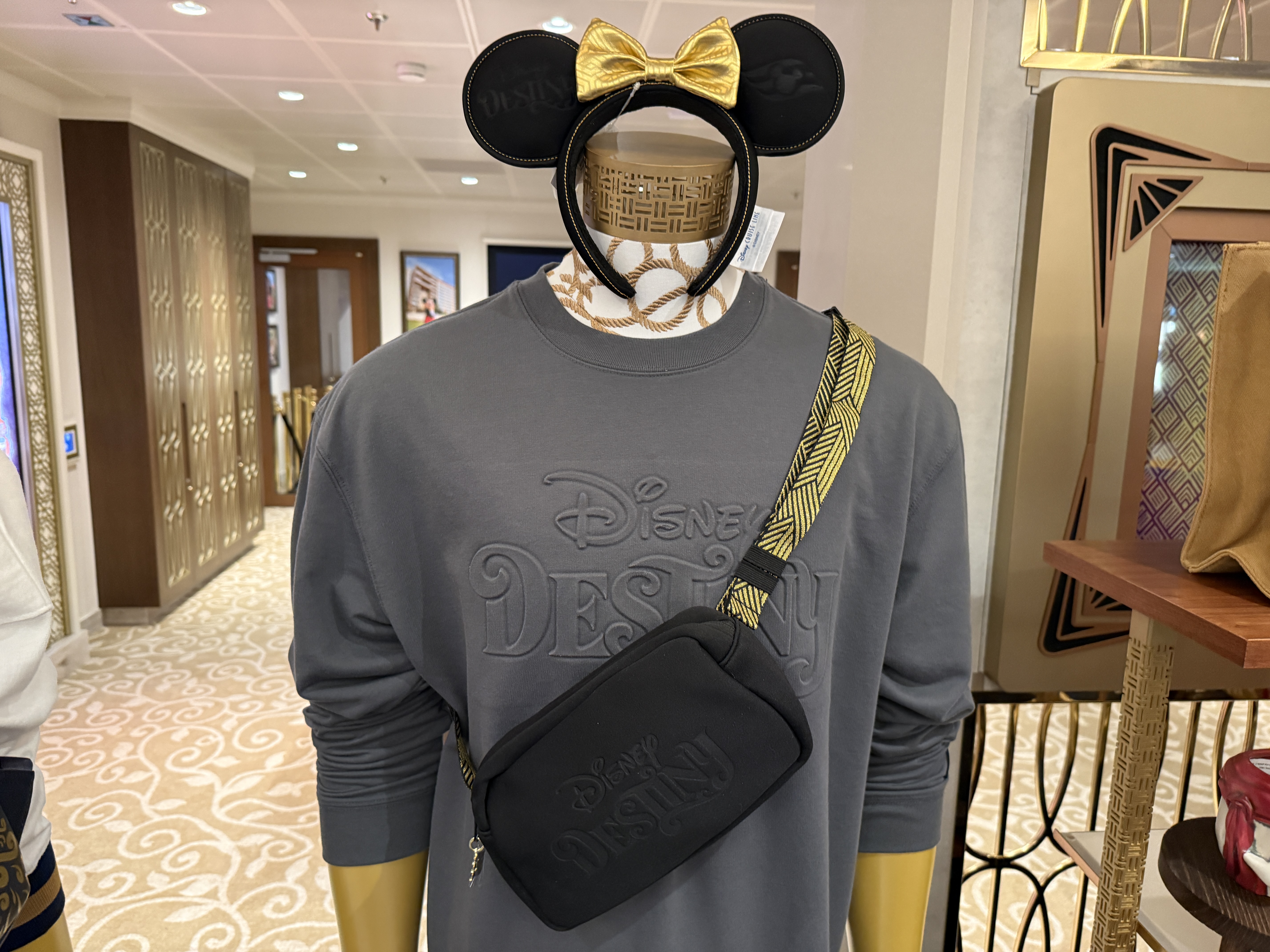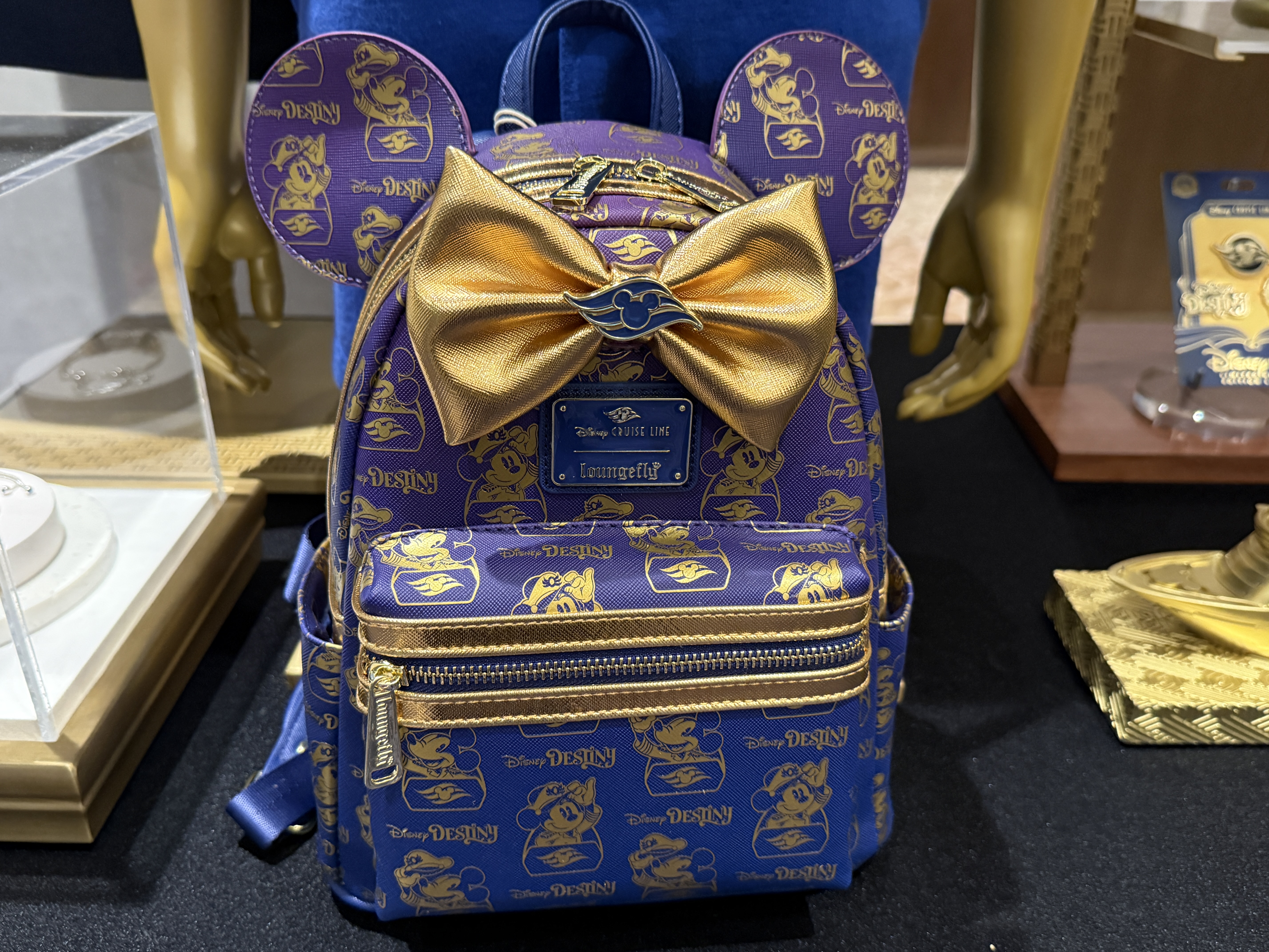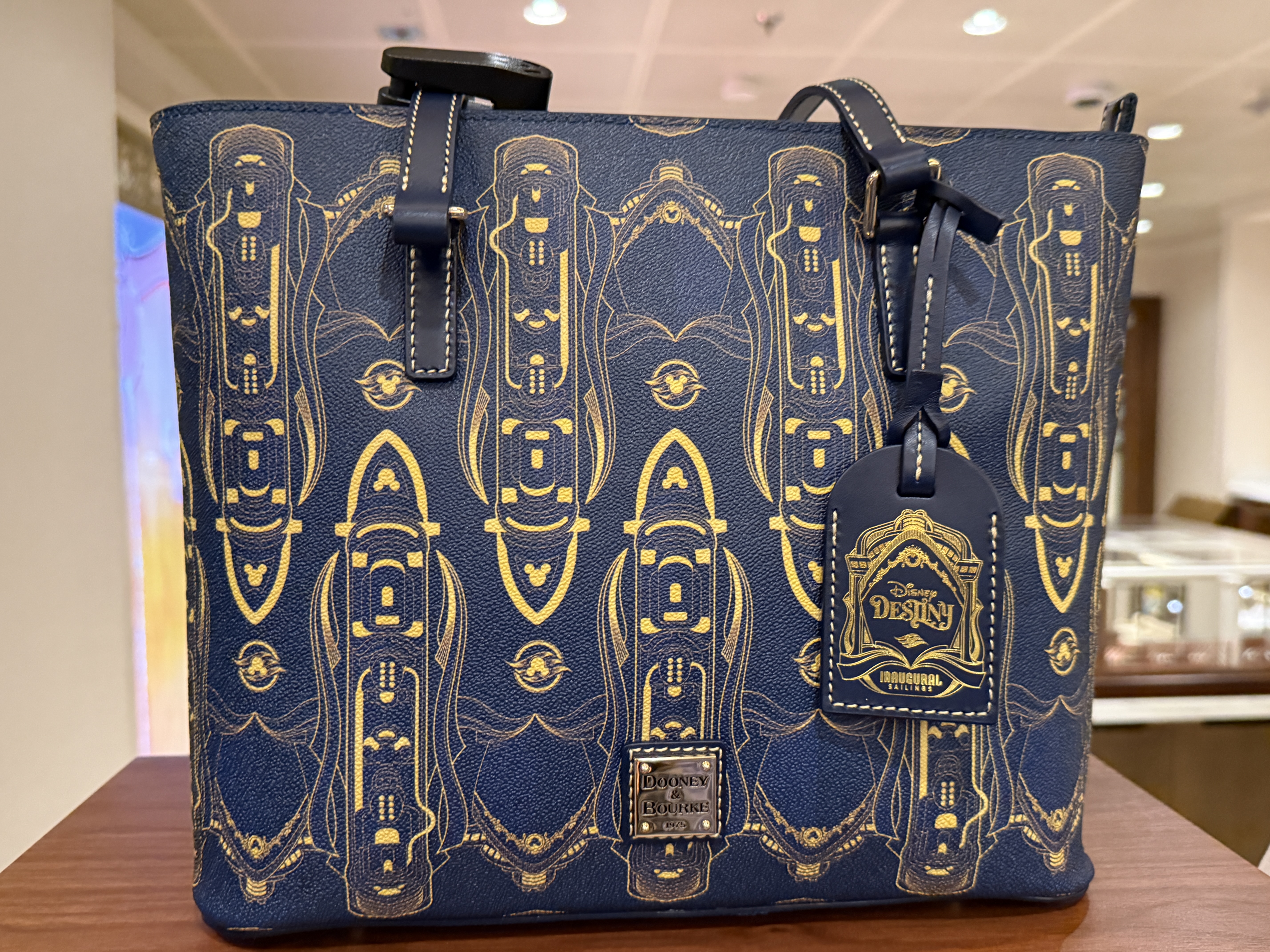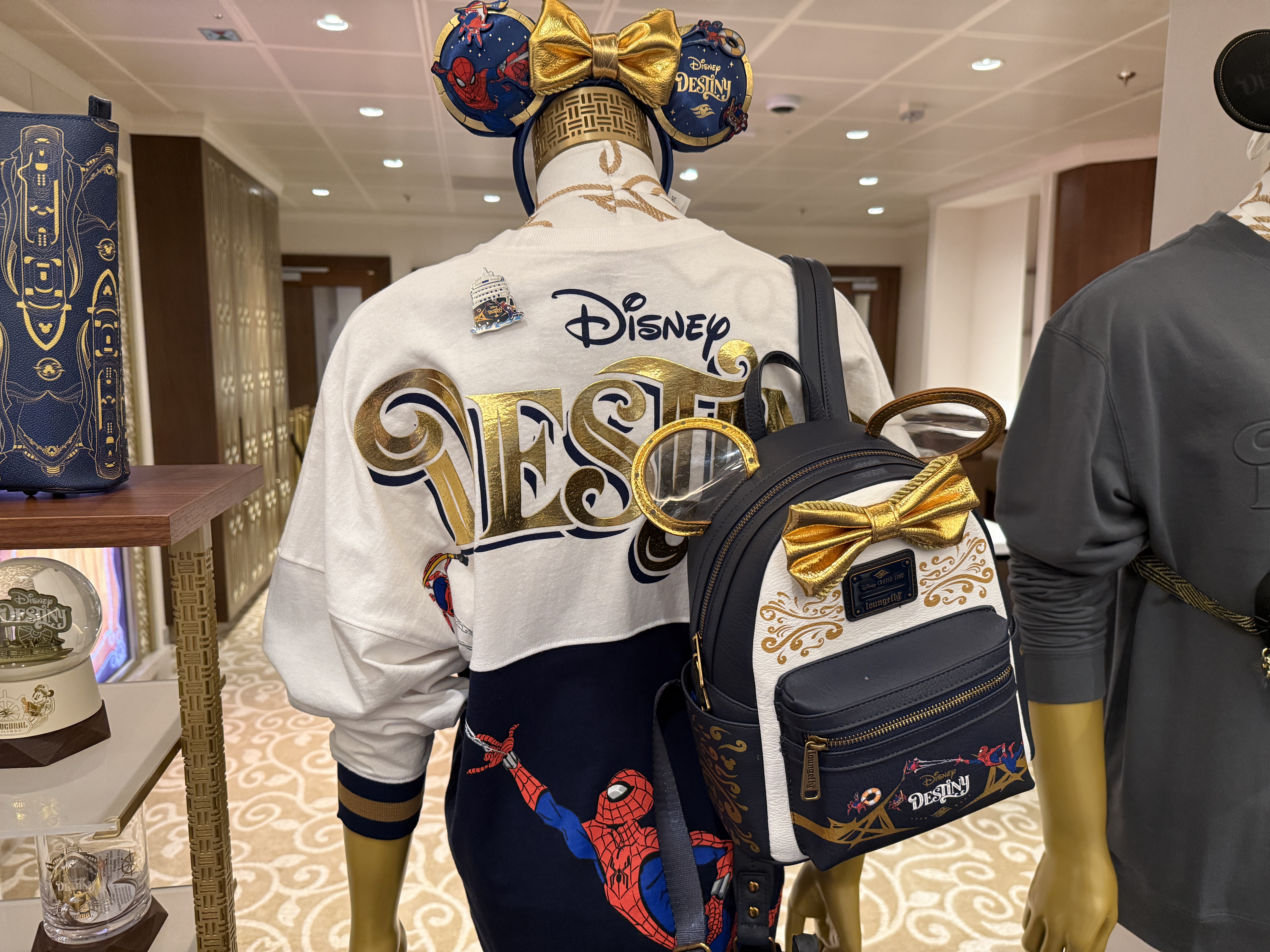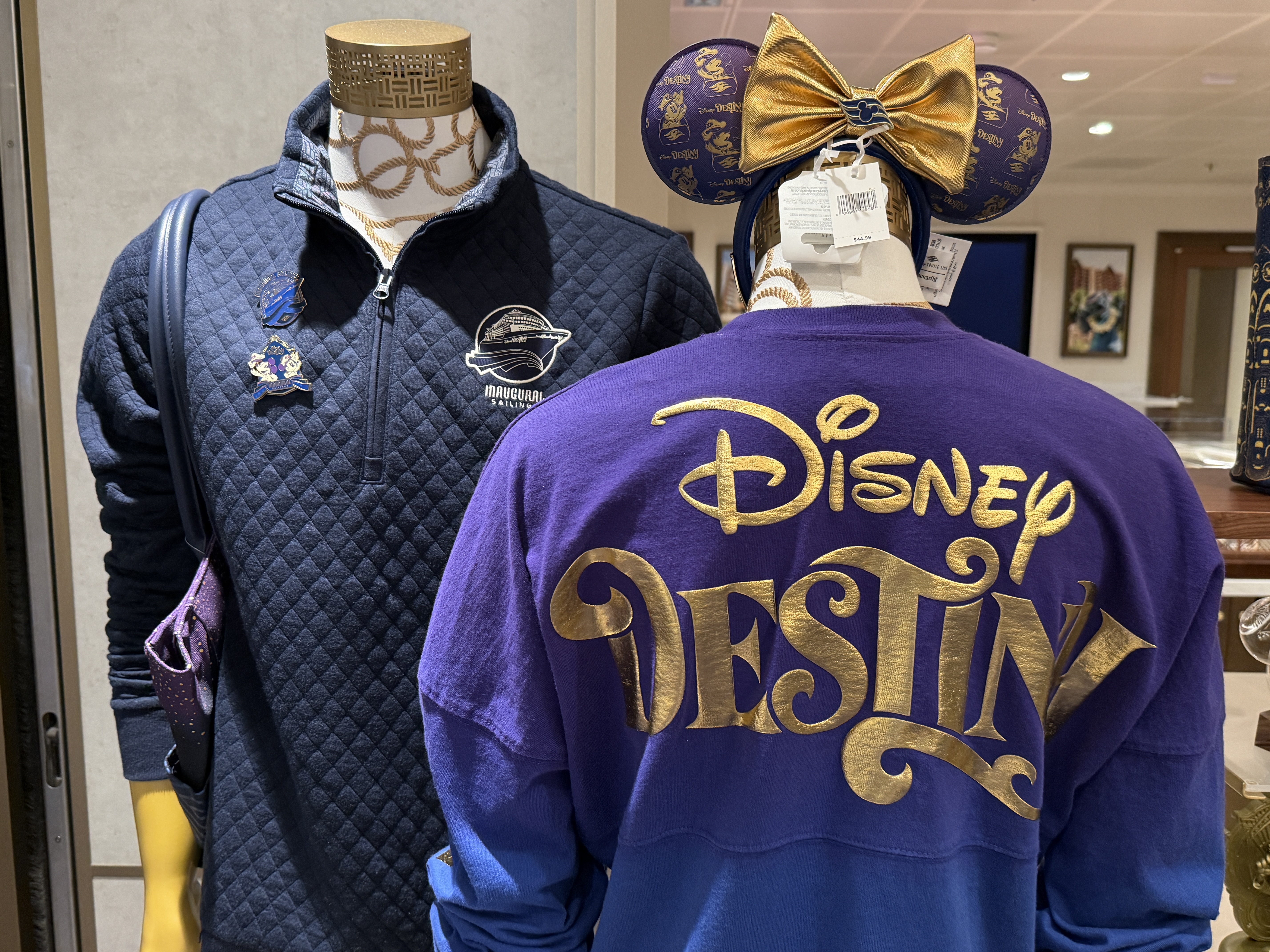 Those cruising aboard the Disney Destiny during its first year of sailings will be able to pick up items from the Inaugural Collection – ranging from a Loungefly and Spirit Jersey, to a Dooney & Bourke bag and more apparel options. The collection leans into deep blue, rich purple and gleaming gold hues to reflect the Grand Hall.