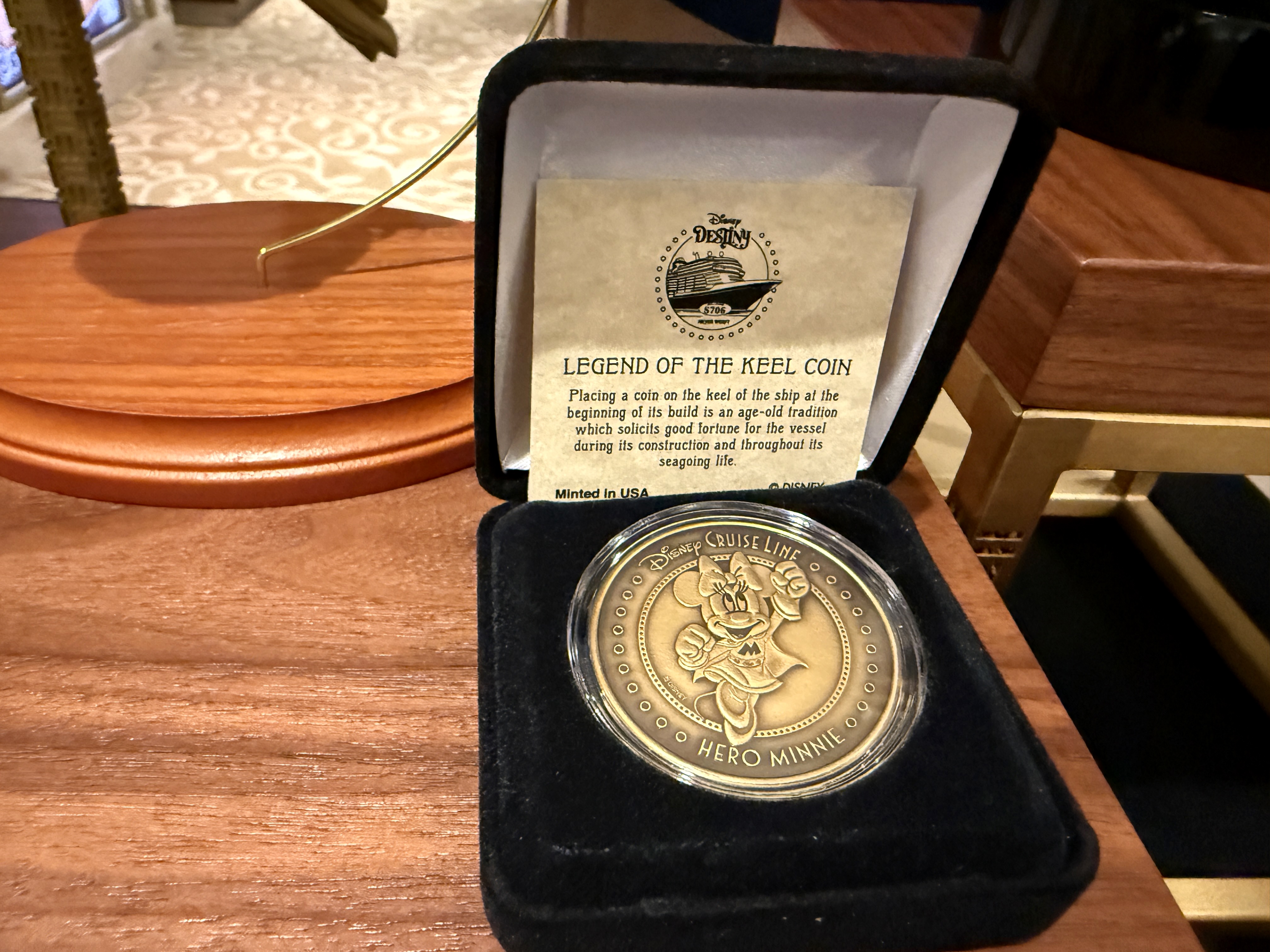 Placing a coin on the keel of the ship at the beginning of its build is an age-old tradition which solicits good fortune for the vessel during its construction and throughout its seagoing life. Featuring Hero Minnie, you can take home your very own keel coin.