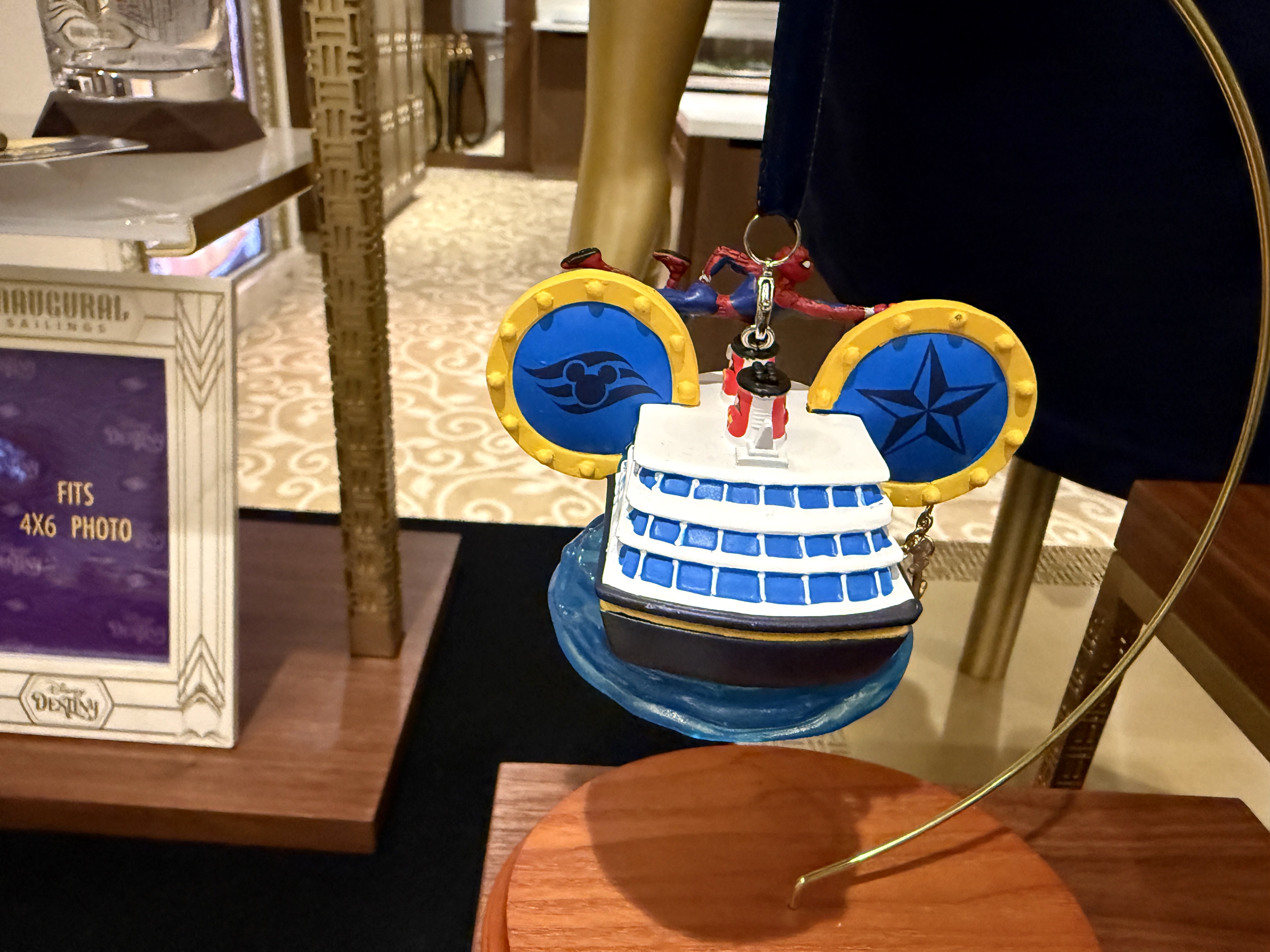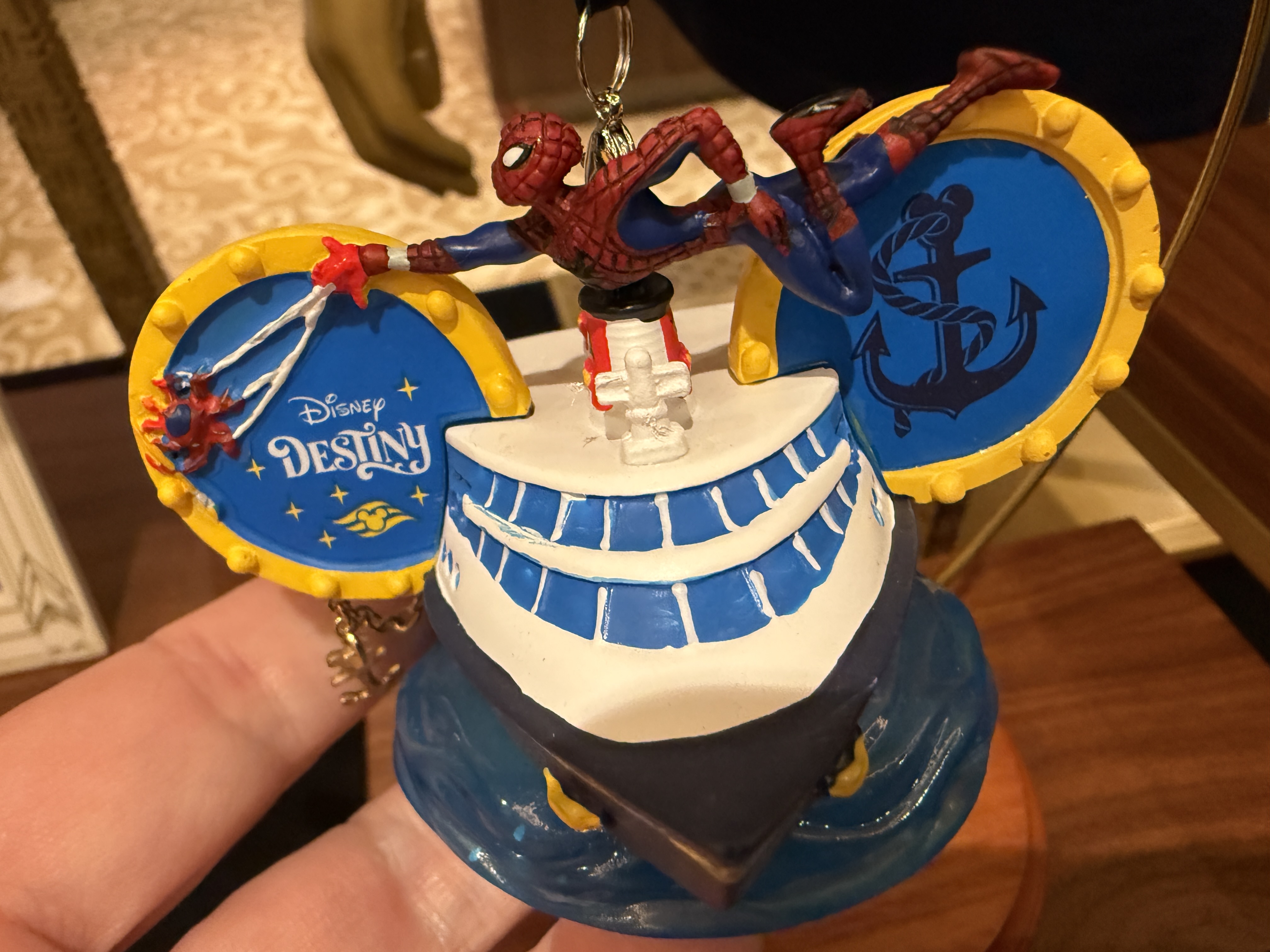 The Disney Destiny Ship Collection includes a themed Spirit Jersey, ear headband, ornament, beach towel, pin and more, most inspired by the statue of Spider-Man that adorns the stern of the ship.
