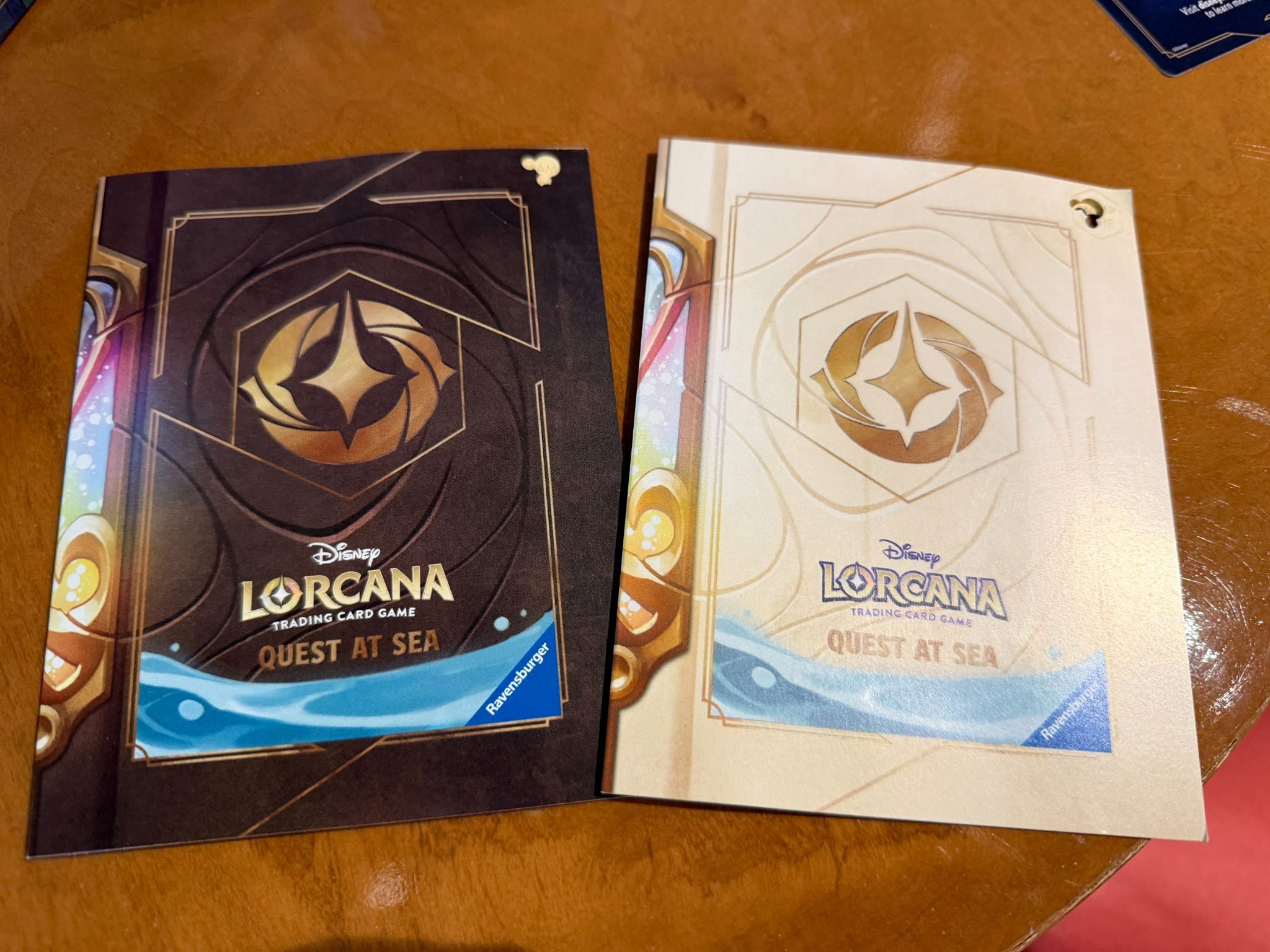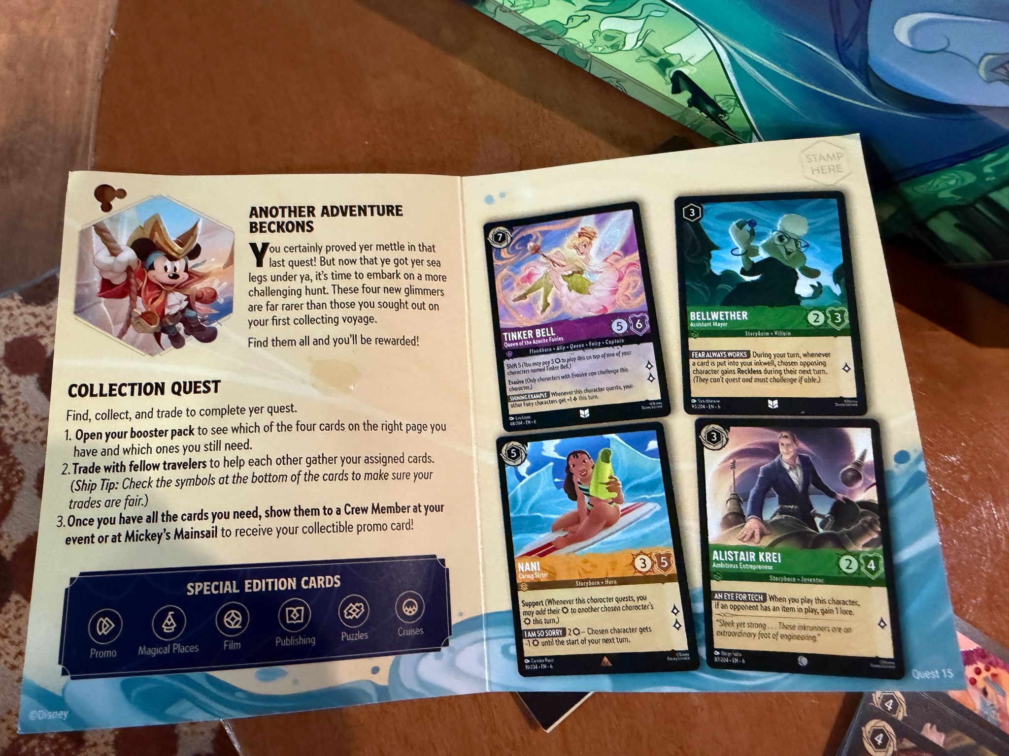 At both the free Collector Quest and the paid Collector Challenge events, Guests receive at least one free Azurite Sea Booster Pack, which comes in a Disney Lorcana Quest at Sea pamphlet. Inside, Guests are shown 4 cards that they must collect in order to redeem for one of the two cards exclusive to that event.
