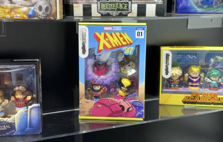 The upcoming Little People Collector Marvel X-Men: Issue 1 set (TBD, 13+, Fall 2025) features Wolverine, Gambit, Nightcrawler, and Storm in comic-accurate outfits. The packaging resembles a classic comic book, with a front cover depicting an epic battle, printed spine and page edges on the sides, and a full illustrated spread on the back—one half of which will be completed with a second X-Men product launch.