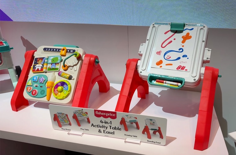 Rounding out the offerings is the Laugh & Learn 4-in-1 Activity Table & Easel ($59.99, 6M–36M, Fall 2025), which evolves from a sit-and-play table to a toddler easel. The activity side features Smart Stages content with 135+ sounds, songs, and phrases, as well as tactile elements like a spinning color wheel, flip book, and bead bar. The easel side includes a clip for paper, a supply tray, and storage slots for markers and crayons—perfect for creative early learners.