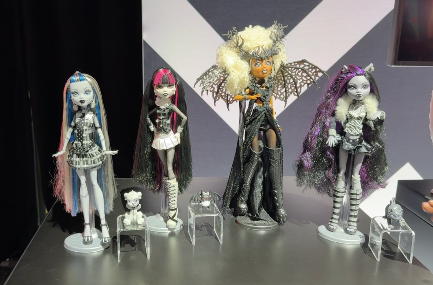 The Fall 2025 Monster High® Reel Drama™ dolls — Frankie Stein™, Draculaura™, and Clawdeen Wolf™ ($24.99 each) — pay tribute to vintage black-and-white horror films with cinematic styling and mini/poster pairings. Each character arrives with their signature pet and iconic accessories, all captured in grayscale with dramatic flair that harks back to Monster High’s original ghoul squad.