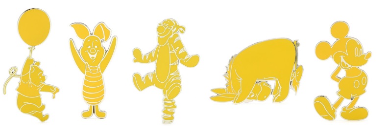 - Beyond the cuddly friends, guests can accessorize with Winnie the Pooh & Friends plush bag charms (£25 each) and a series of "un-bear-ably" cute limited-edition pins (£18 each). The pin collection showcases stylized designs of Pooh, Piglet, Tigger, and Eeyore, alongside a standout pin celebrating Mickey Mouse in his classic pose, all in the bold yellow colorway.